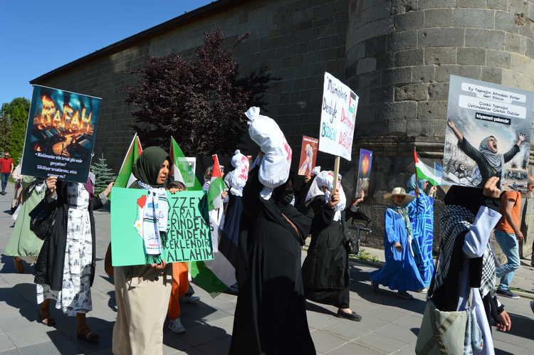Kent merkezindeki Lalapaşa Camisi önünde bir araya gelen doktorlar, tıp fakültesi öğrencileri ile sağlık çalışanları, Türk ve Filistin bayrakları eşliğinde taşıdıkları döviz ve pankartlarla Yakutiye Medresesi'ne kadar yürüdü.