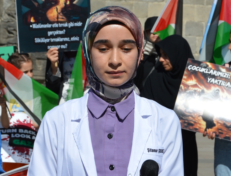 Grup adına konuşan Atatürk Üniversitesi Tıp Fakültesi Öğrencisi Şifanur Şeker, Gazze'yi unutmayan ve unutamayan sağlık çalışanları olarak 32'inci kez bir araya geldiklerini söyledi.