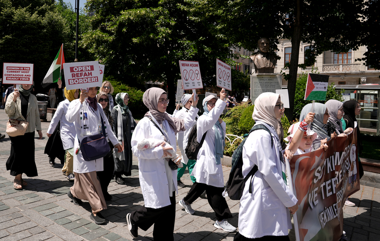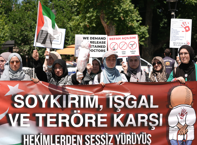 "Dün Nuseyrat Kampı'na saldırı düzenlendi, çok sayıda şehit ve yaralı var. Yine dün 5 yaşındaki bir çocuğun açlıktan 8 kiloya düşmüş olduğunu gördük. Bayram günü bir kız çocuğunun babasının cesediyle bayramlaşmasını hep beraber izledik. Bu yaşananların tamamı bütün dünyanın şahitliğinde gerçekleşiyor. Bizler Gazze'yi unutmamak için, vicdanımızı diri tutmak için, zulme karşı olduğumuzu göstermek için Türkiye'deki hekimler ve sağlık çalışanları olarak sessiz yürüyüşümüzün 32. haftasındayız."