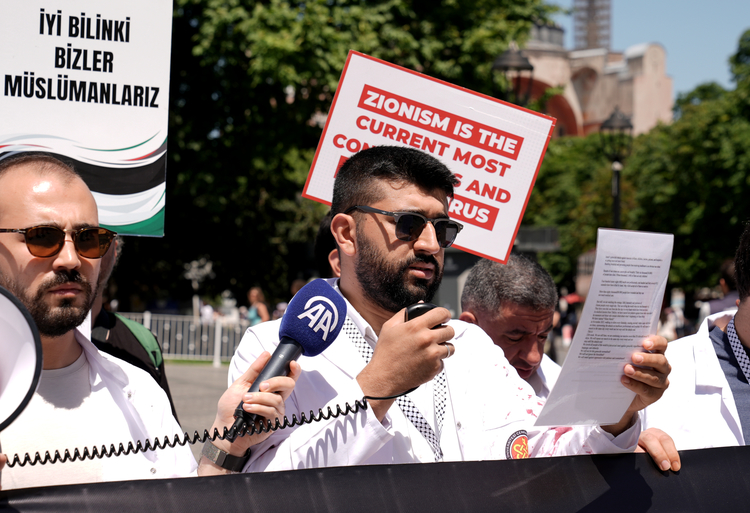 İstanbul Fatih Çemberlitaş'ta 2. Abdülhamid Han Türbesi önünde toplanan grup, "Soykırım, işgal ve teröre karşı hekimlerden sessiz yürüyüş" yazılı pankart açtı.