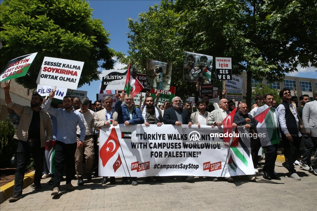 Türk ve Filistin bayrakları ile "Ey dünya daha kaç çocuk ölmeli", "Türkiye'deki öğrenciler Filistin için birleşti", "Zulme ve zulmün ortaklarına sessiz kalmıyoruz" ve "Filistin özgür değilse tüm dünya tutsaktır" yazılı dövizler taşıyan öğrenciler, sloganlar atarak yerleşke içindeki Yaşam Merkezi'ne kadar "SayStop" yürüyüşü gerçekleştirdi.