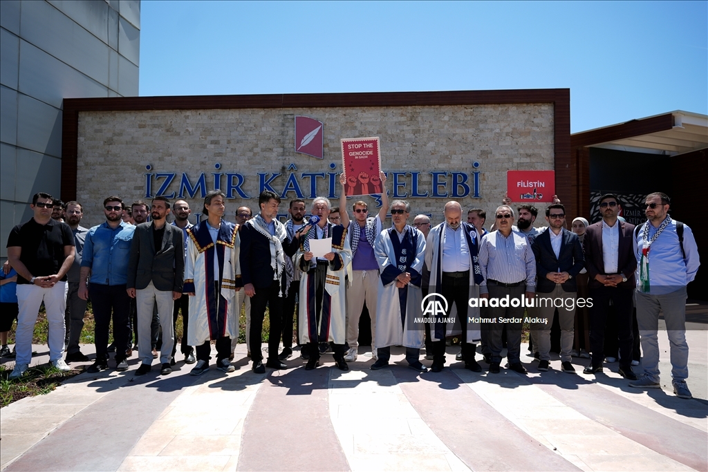 "Stop the genocide in Gaza" yazılı dövizler taşıyan akademisyenler adına açıklama yapan İKÇÜ Mühendislik Fakültesi Öğretim Üyesi Prof. Dr. Mehmet Çevik, Gazze'de yaşanan zulmü telin etmek ve ABD başta olmak üzere dünyanın dört bir yanındaki üniversitelerde İsrail'i protesto eden akademisyenler ve öğrencilerle dayanışma mesajı vermek üzere toplandıklarını belirtti.