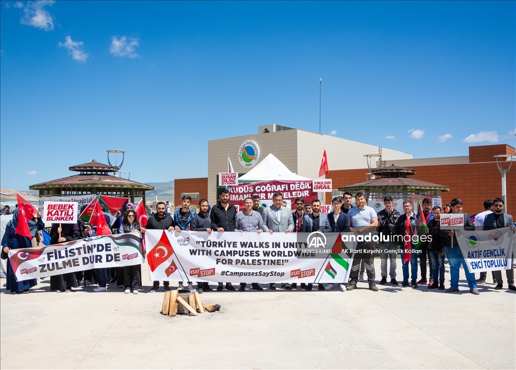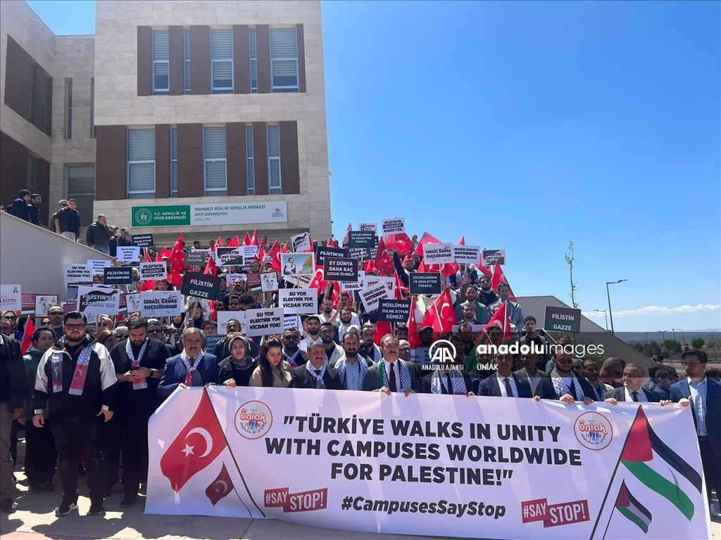 Hitit Üniversitesi, AK Parti Çorum Gençlik Kolları İl Başkanlığı ve AK Parti Gençlik Kolları Üniversite Birimi (ÜNİAK) tarafından organize edilen etkinlik kapsamında Kuzey Kampüs Sosyal Tesisler önünde bir araya gelen öğrenciler, "Direnişe selam boykota devam", "Nehirden denize özgür Filistin", "Çorum'dan Filistin'e, direnişe bin selam", "Katil İsrail Filistin'den defol" şeklinde sloganlar attı.