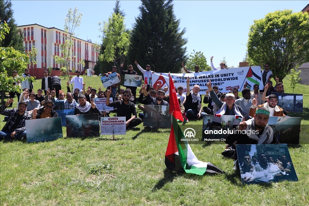 Yabancı Diller Fakültesi önünde bir araya gelen öğrenciler, taşıdıklarını Türk ve Filistin bayrakları ile "Filistin'de zulme dur de", "Filistin özgür olacak", "Filistin'in başkenti Kudüs'tür", "Kudüs coğrafi bir mesele değil, imani bir meseledir." "Yıkılsın İsrail", "Zulme karşı susan dilsiz şeytandır", "SayStop" yazılı dövizlerle İsrail aleyhine slogan atarak yürüdü.