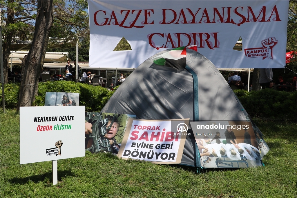 Bir süre oturma eylemi yapan öğrenciler, daha sonra sloganlar atarak tekbir getirdi, Filistin'e destek çadırı kurdu.