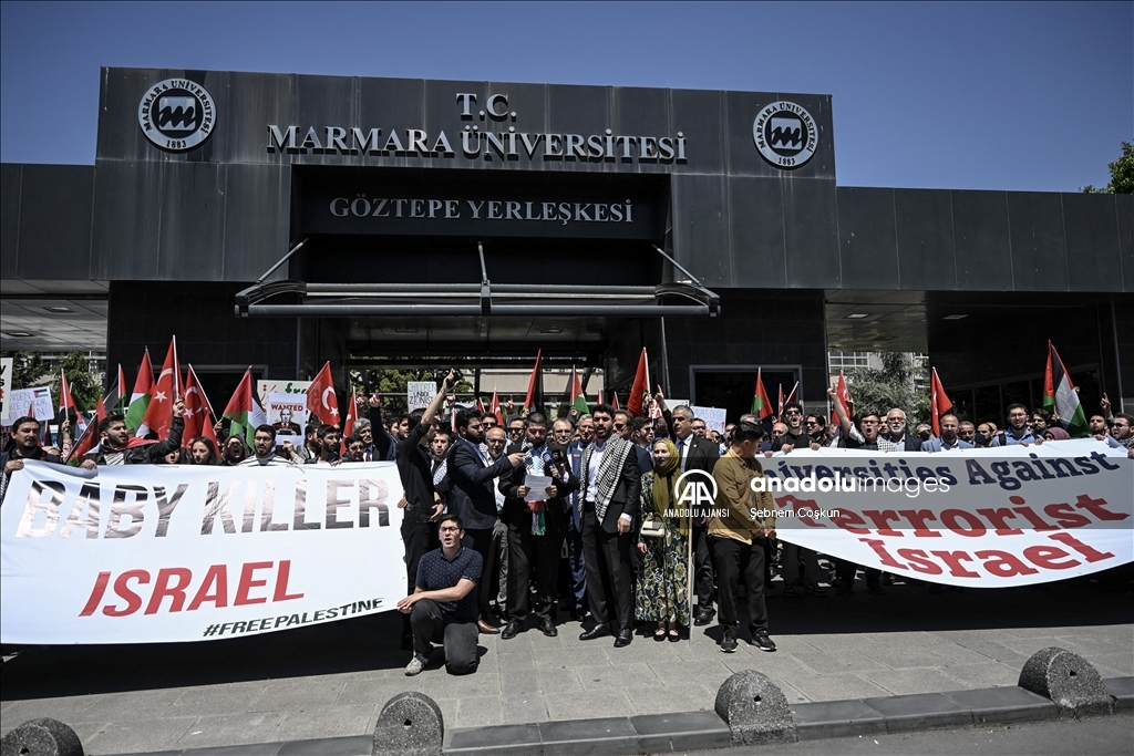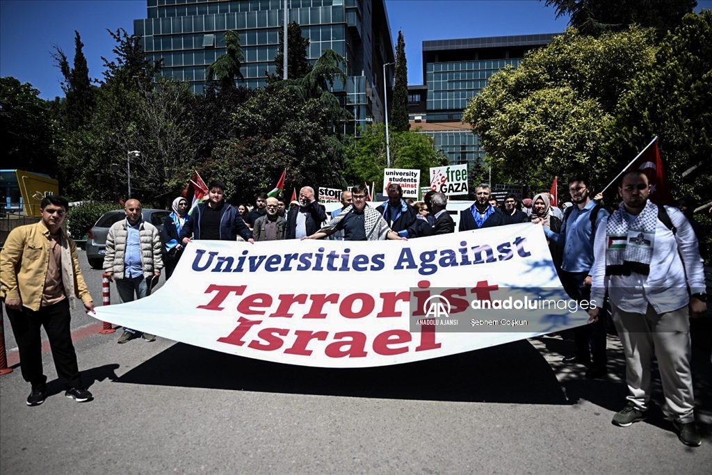 Basın açıklamasının ardından katılımcılar, ellerinde döviz ve pankartlarla İsrail aleyhinde sloganlar atarak yerleşkede yürüdü.