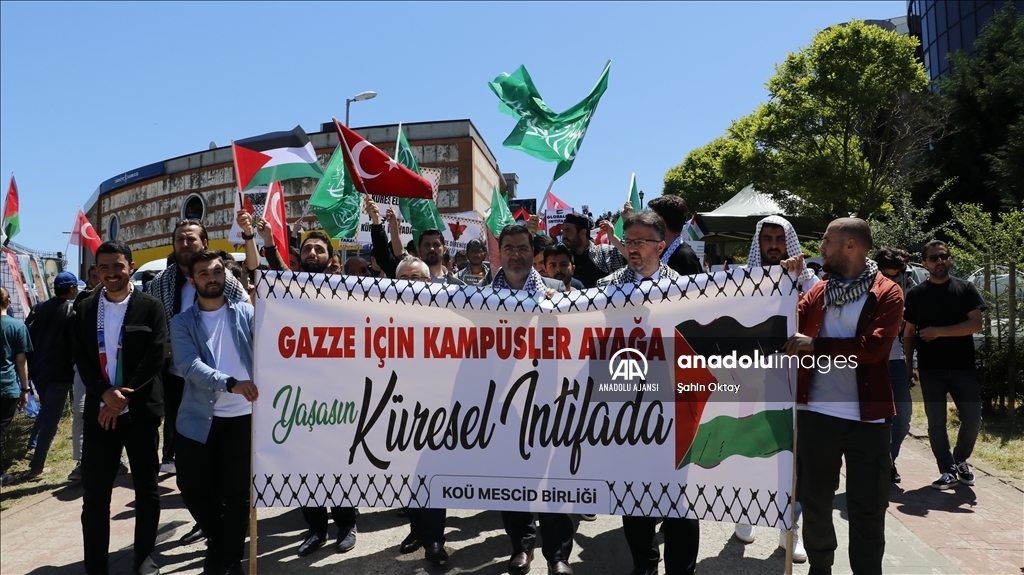 Filistin bayrağı ile "Gazze için kampüsler ayağa", "Yaşasın küresel intifada", "İstikbal İslam'ın" pankartları açan katılımcılar, daha sonra sloganlar eşliğinde yürüyüşe geçti.