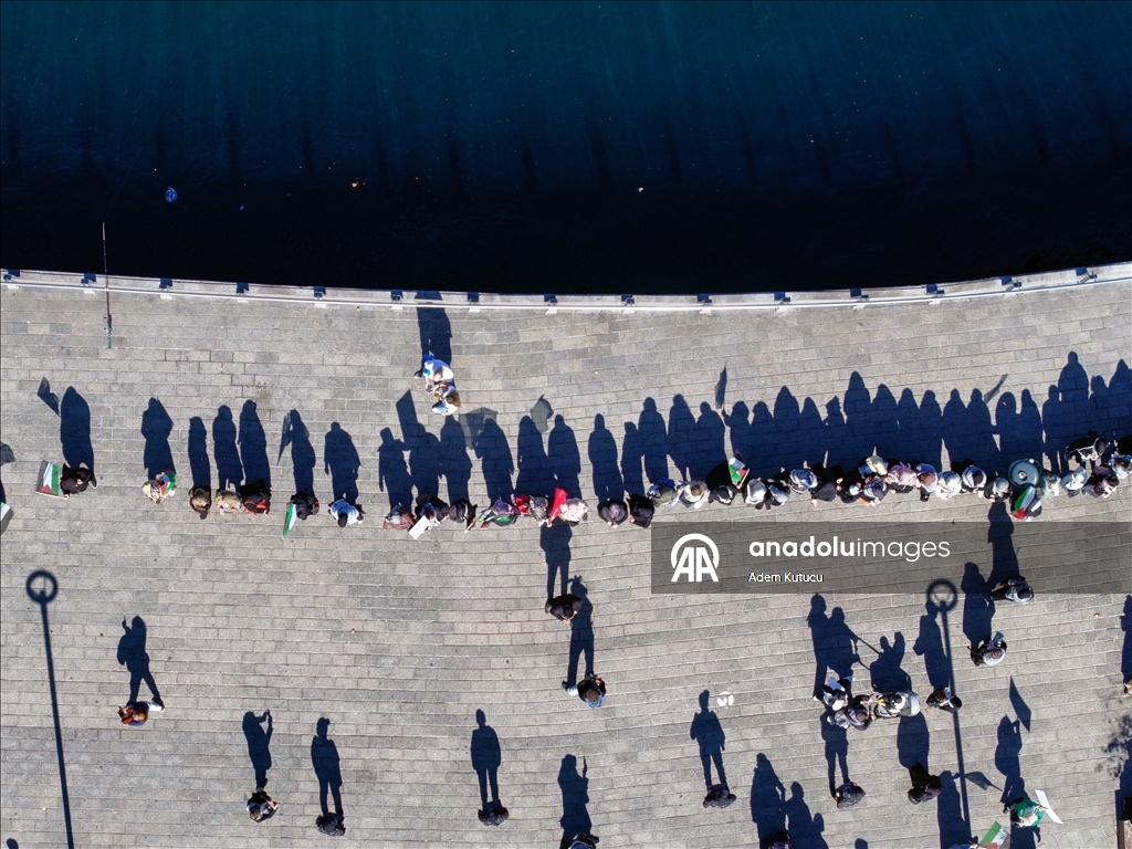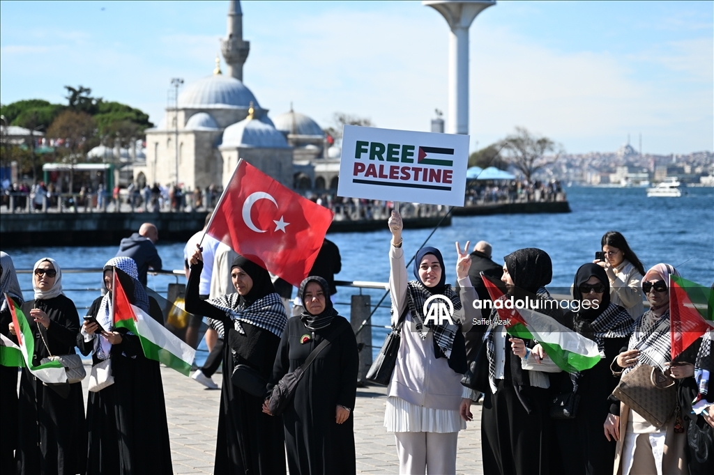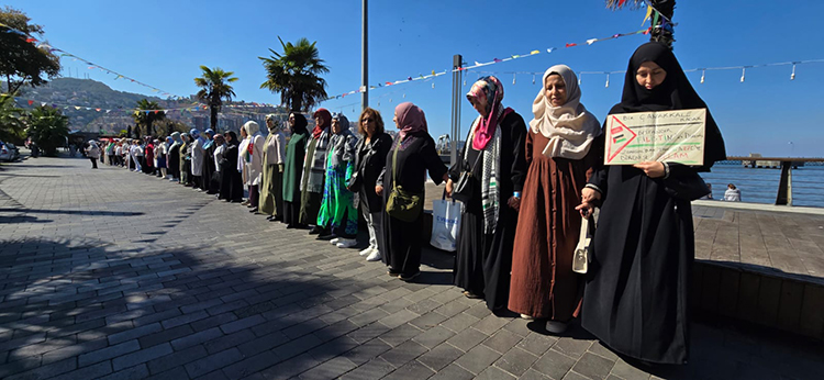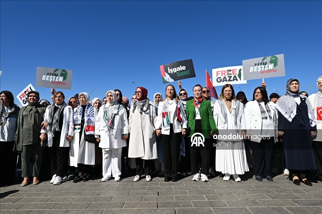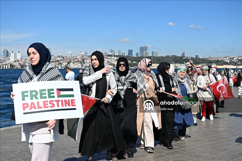 Üsküdar Sahili'nde bir araya gelen kadınlar, ellerinde Türk ve Filistin bayrakları ile çeşitli pankartlar taşıyarak Gazze'de yaşananları protesto etti. Sahil boyunca el ele tutuşan kadınlar, yüzlerce metrelik zincir oluşturdu ve İstanbul Boğazı'na karanfil bıraktı.