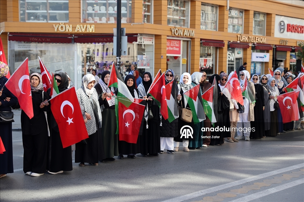 Sivas Devlet Hastanesi önünde ellerinde Türk ve Filistin bayraklarıyla toplanan kadınlar, kol kola girerek zincir oluşturdu ve Cumhuriyet Meydanı'na kadar yürüdü.