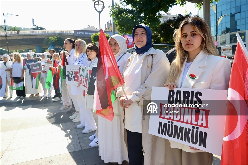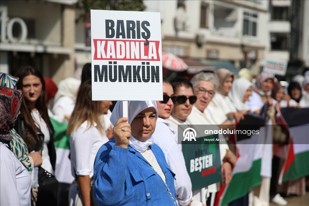 Beyaz renk kıyafetler giyen ve boyunlarına kefiye bağlayan kadınlar, ellerinde Filistin ve Türk bayrakları ile "Filistin için tek yüreğiz", "Özgür Filistin", "İşgale son", "Filistin özgür olacak", "Barış kadınla mümkün" yazılı pankartlar taşıdı.