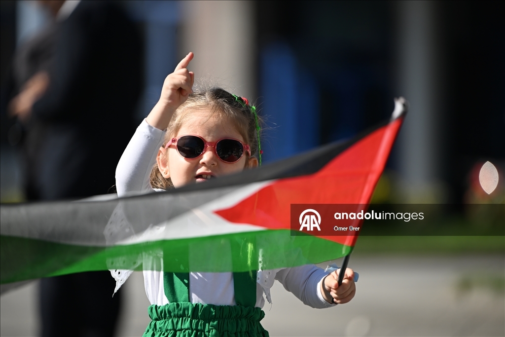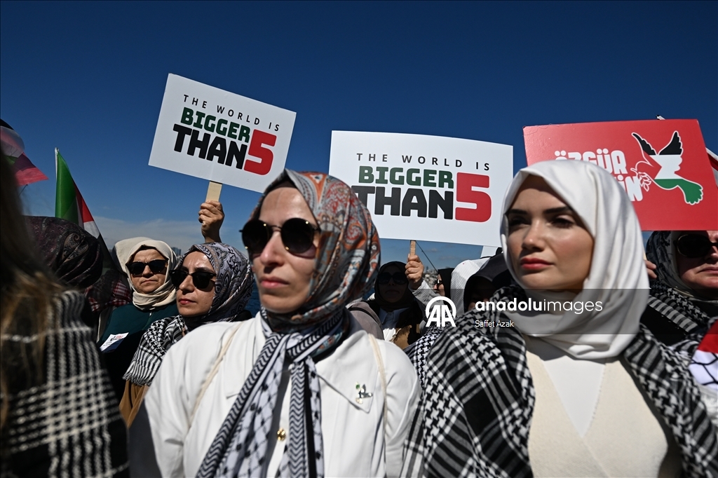 Türk ve Filistin bayrakları açan katılımcılar, 'dünya beşten büyüktür", 'özgür Filistin', 'Gazze için sessiz çığlık' yazılı dövizler taşıdı.