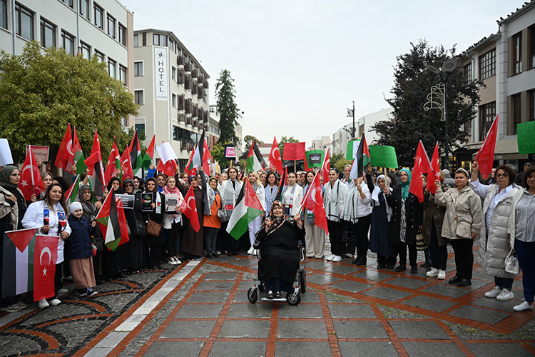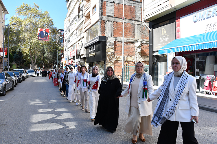 Etkinlikte konuşan AK Parti Zonguldak İl Kadın Kolları Başkanı Tülay Sayılı, 81 ilde kurulan zincirin, Gazze'de evlatlarını kaybeden anne ve babaların, öksüz yetim bırakılan çocukların zinciri olduğunu belirterek, "Yüce Rabbimiz mealen 'Bir insanı öldüren, bütün insanlığı öldürmüş gibidir. Bir canı yaşatan, bütün insanlığı yaşatmış gibidir.' buyuruyor. Gazze, bu ilahi kelamın sarsıcı bir imtihanıdır. Bizler İstanbul'dan, Hakkari'den, Trabzon'dan, Erzurum'dan ve Türkiye'nin 81 ilinden dünyanın dört bir yanındaki kadınlara, kız kardeşlerimize sesleniyoruz; barış kadınla mümkün" diye konuştu.