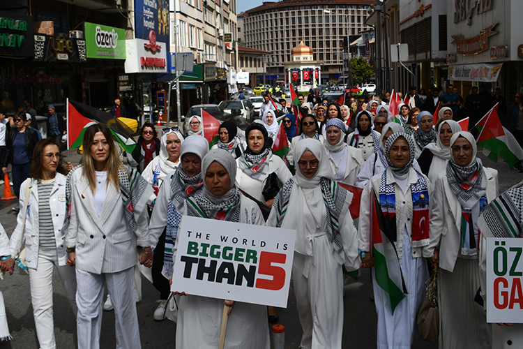 Yozgat Otogar mevkisinde toplanan kadınlar, ellerindeki pankartlar ile Türk ve Filistin bayraklarıyla Cumhuriyet Meydanı'na kadar yürüdü.
