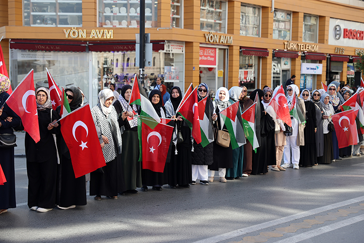 Türk ve Filistin bayraklarıyla oluşturulan insan zincirine katılan kadınlar, İsrail'in Gazze'de 7 Ekim 2023'ten bu yana sürdürdüğü saldırılara sessiz bir yürüyüşle tepki gösterdi.