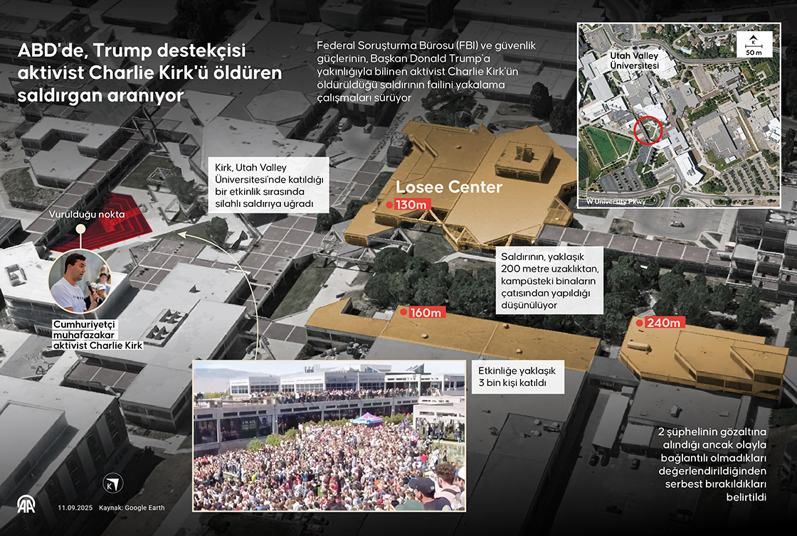 ABD'nin Utah eyaletinde Başkan Donald Trump'a verdiği güçlü destekle bilinen ve özellikle gençler arasında popüler olan aktivist ve sosyal medya fenomeni Kirk, çarşamba günü yerel saatle öğleden sonra Utah Valley Üniversitesi'nde katıldığı bir etkinlik sırasında silahlı saldırıya uğramıştı.