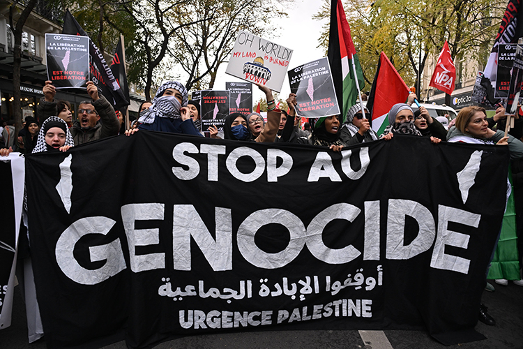 Başlarına Filistin kefiyesini takan göstericiler, ellerinde "Gazze ve Batı Şeria'da katliamı durdurun", "Soykırımı durdurun" ve "Ateşkes" yazılı dövizlerin yanı sıra Filistin bayrakları taşıdı.