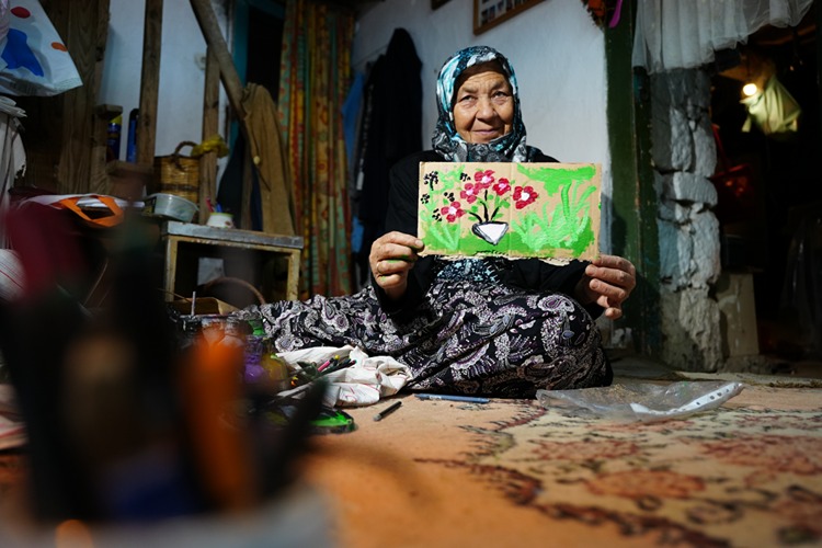 Boş vakitlerinde köydeki evinde patik ören, bahçesindeki bitkilerle ilgilenen Gürel, ilk kez 15 yıl önce eline aldığı renkli boyalarla çizdiği resimlerini yalnızlığına ortak etti.