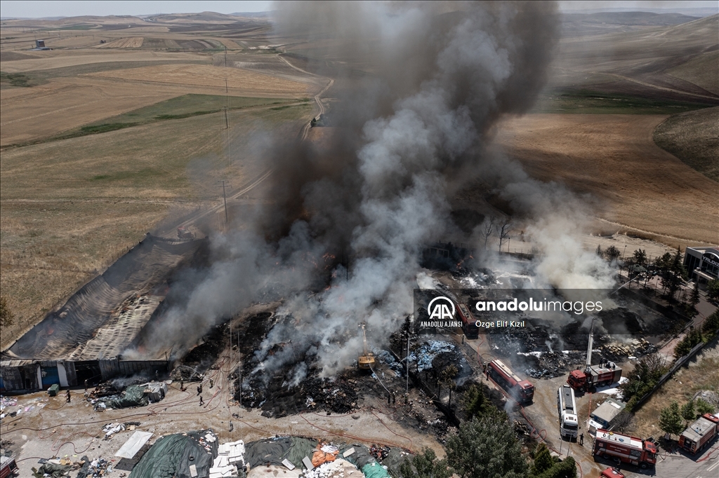 Ankara'nın Gölbaşı ilçesindeki yatak fabrikasında çıkan yangına müdahale ediliyor.