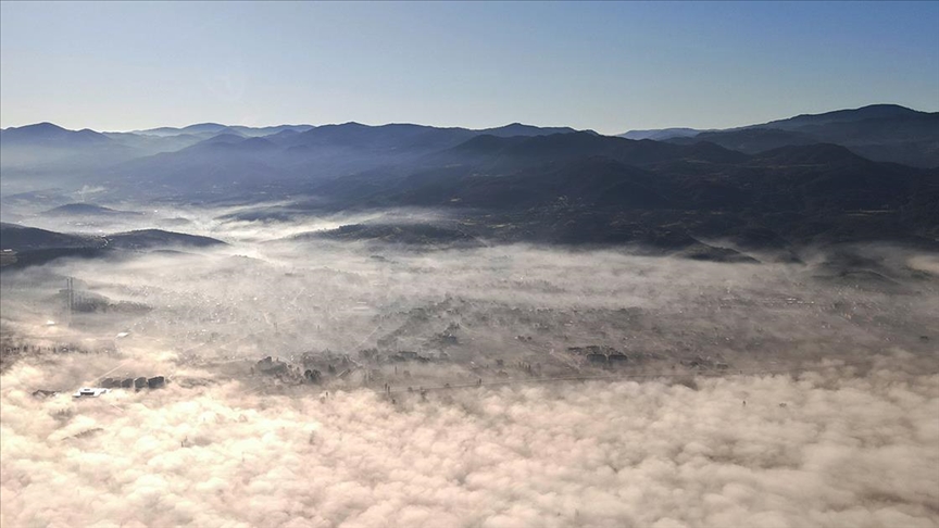 Yüksek kesimlerden bakıldığında ilçeyi kaplayan sis bulutu, dronla görüntülendi.