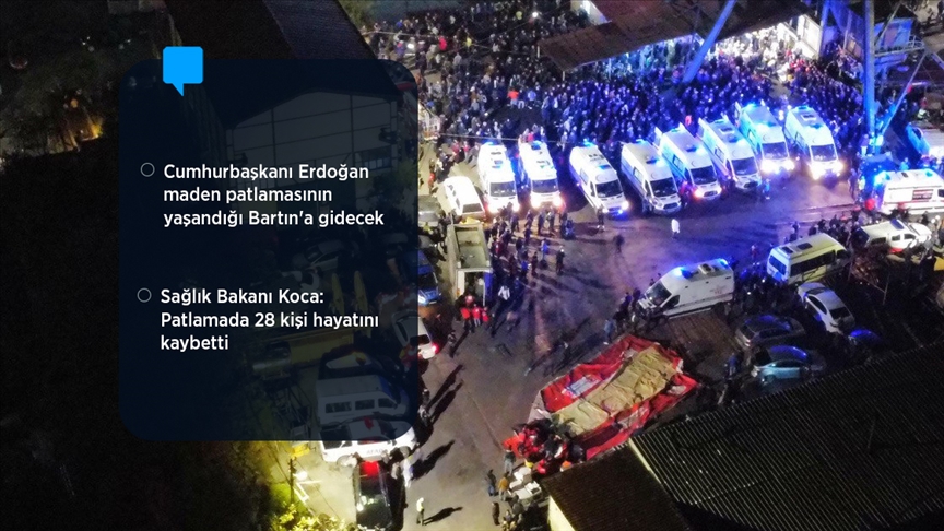 Cumhurbaşkanlığı İletişim Başkanı Fahrettin Altun, Bartın'ın Amasra ilçesindeki maden ocağında meydana gelen patlamada 28 madencinin hayatını kaybettiğini, kurtarılan 58 madenciden 11'inin tedavilerine devam edildiğini bildirdi.