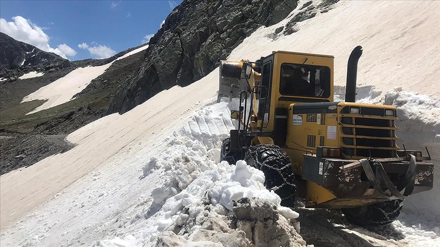 İl Özel İdaresi Konursu Şantiye Şefi Fırat Türk idaresindeki ekip, iş makinesiyle Bayburt-Trabzon arasında "yedi göller" bölgesi olarak da bilinen 2 bin 700 rakımlı Haldizen Yaylası yolunda, yüksekliği yer yer 3 metreyi bulan kar birikintisini temizledi.