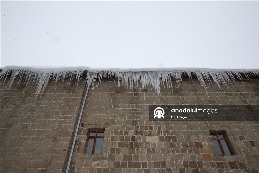 Erzurum'da soğuk hava nedeniyle çatılarda buz sarkıtları oluştu, şadırvan ve demirler buzla kaplandı.