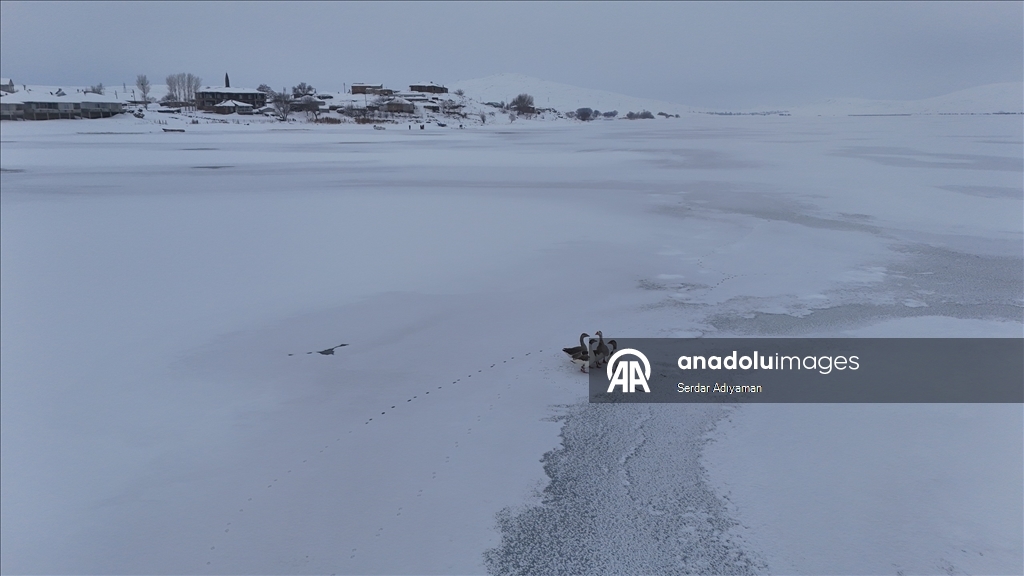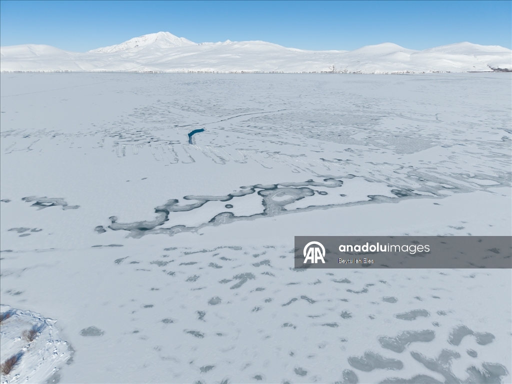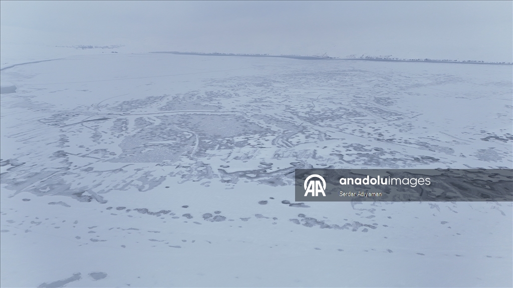 Bitlis'in Ahlat ilçesinde etkili olan soğuk hava nedeniyle Nazik Gölü'nün yüzeyi buz tuttu.