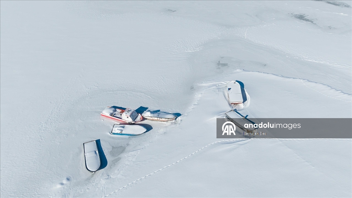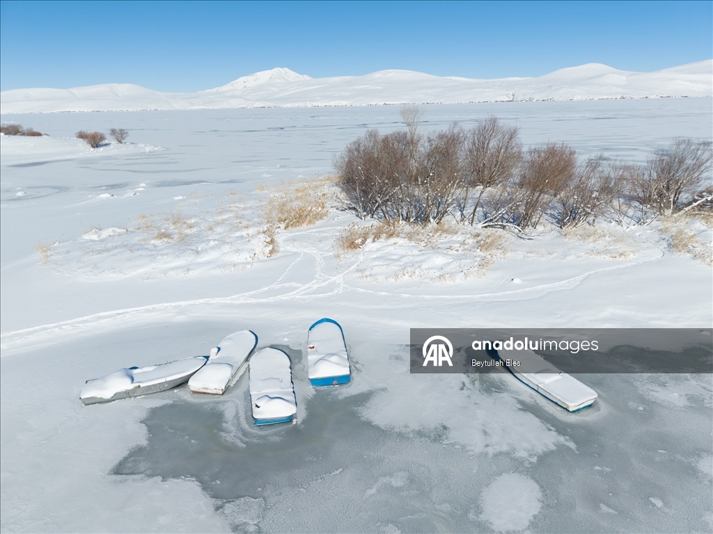 Hava sıcaklığının gece sıfırın altında 10 derece kadar düştüğü ilçede buzla kaplanan göldeki tekneler güzel görüntüler oluşturdu.