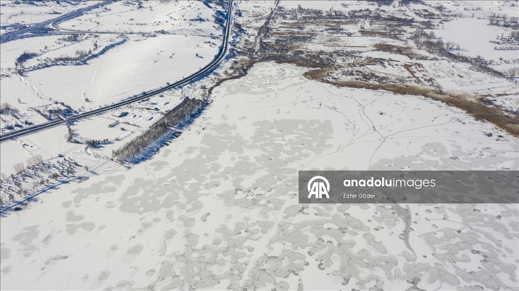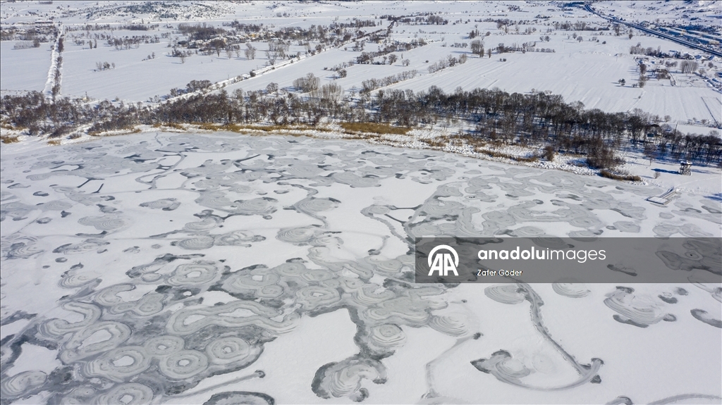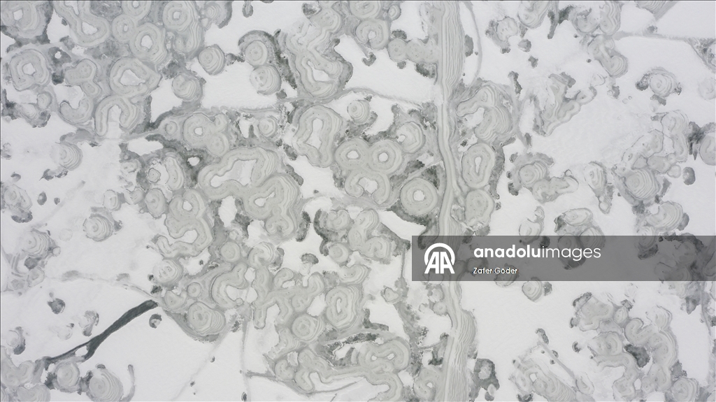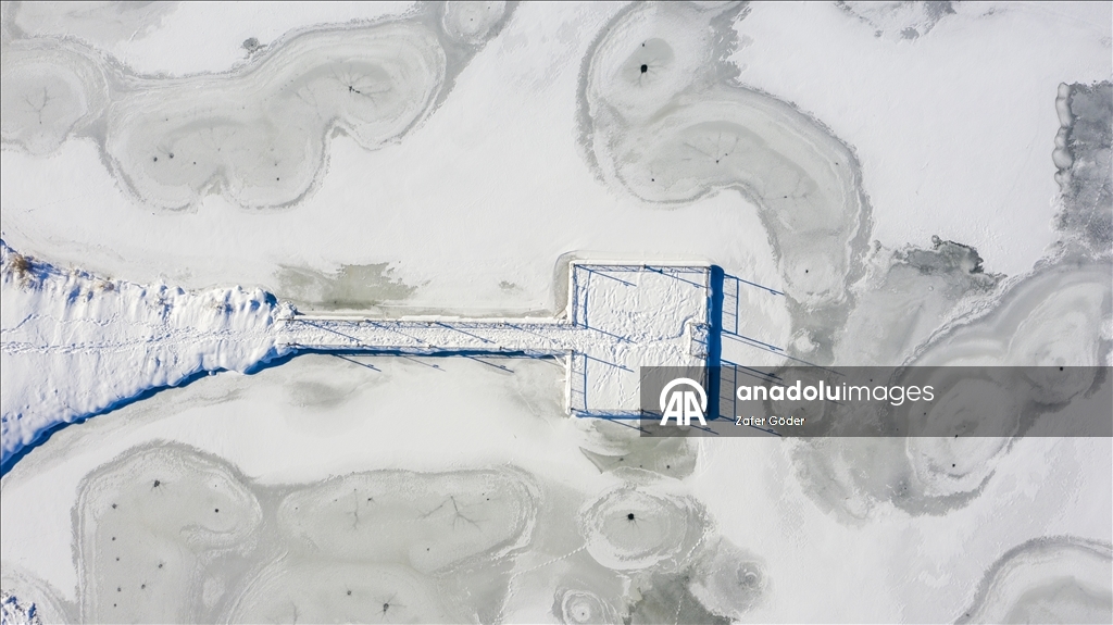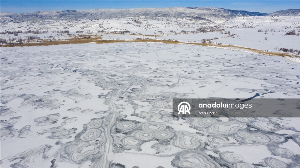 Yüzeyi buz tutan göl, havadan görüntülendi.