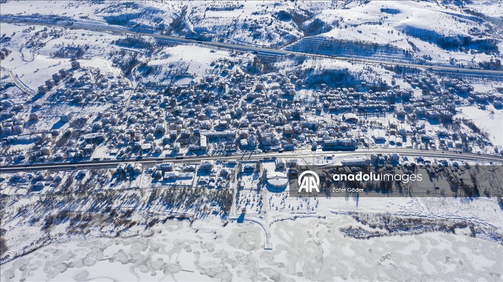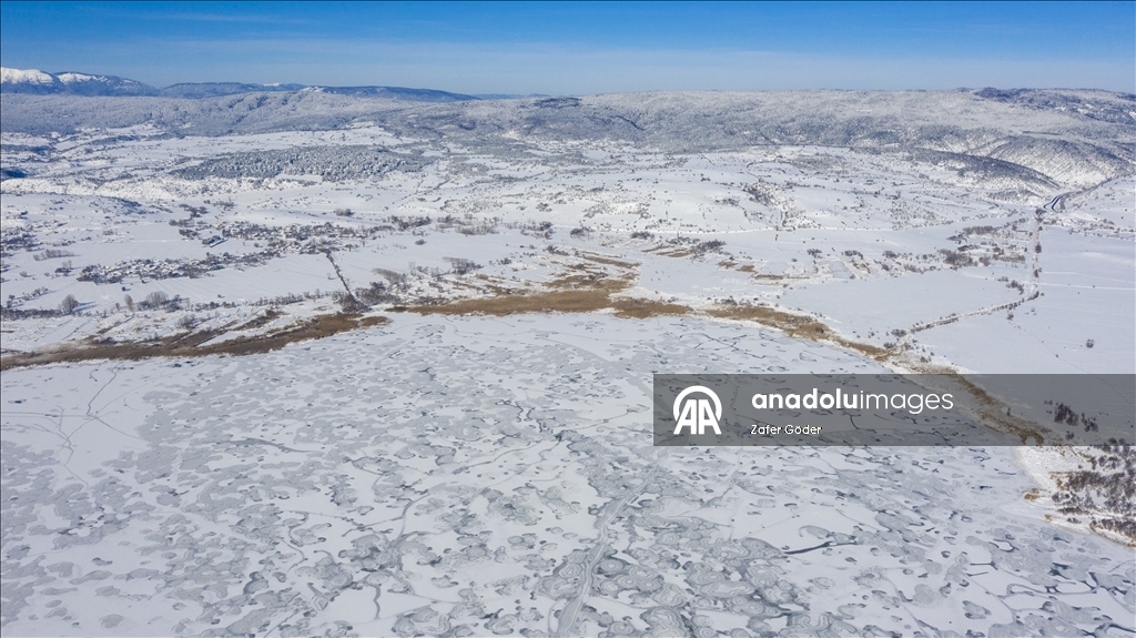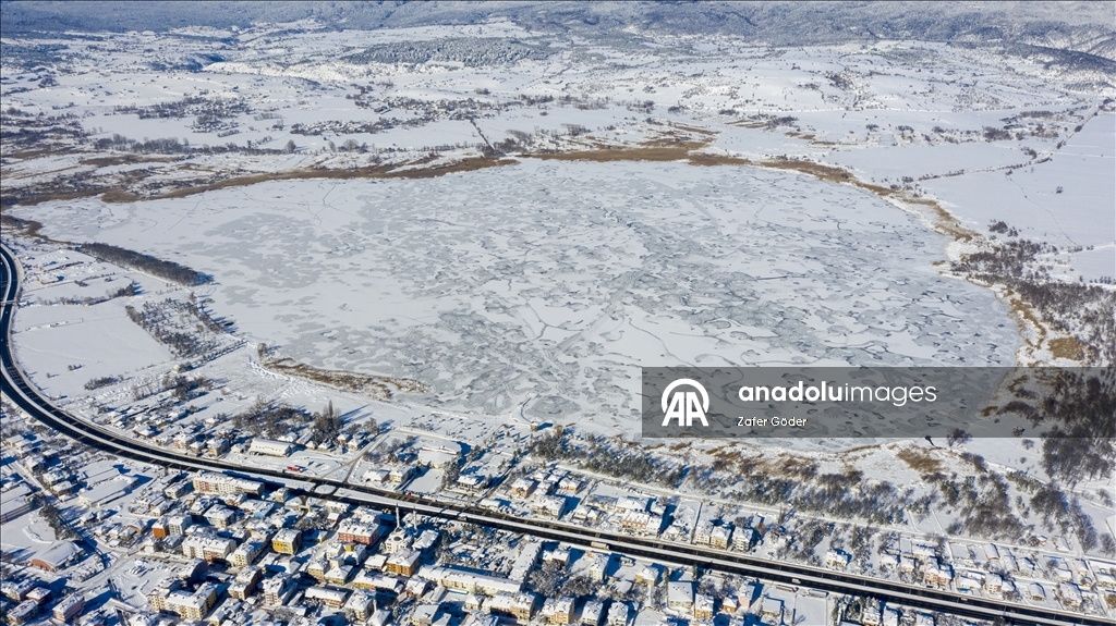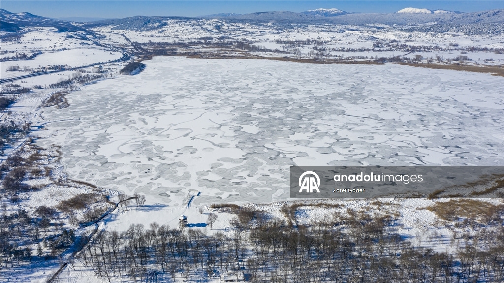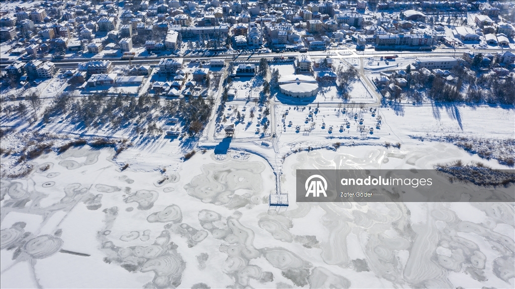 Bolu'da Yeniçağa Gölü'nün yüzeyi buzla kaplandı.