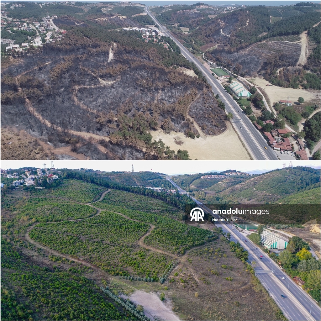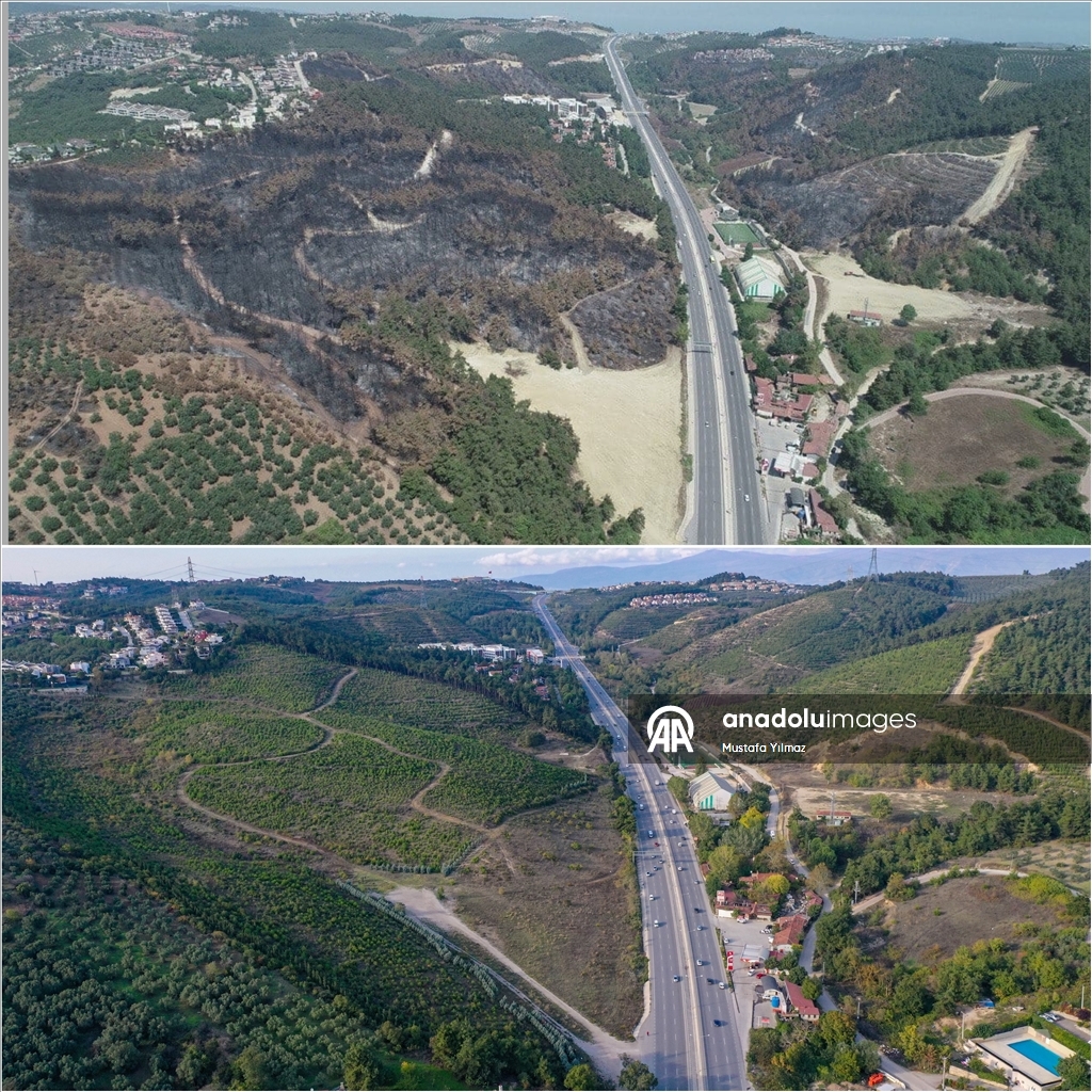 Bursa'nın Mudanya ilçesinde 2015 ve 2018'de çıkan orman yangınlarında tahrip olan alanlar, Bursa Orman Bölge Müdürlüğünün çalışmalarıyla yeniden yeşeriyor.