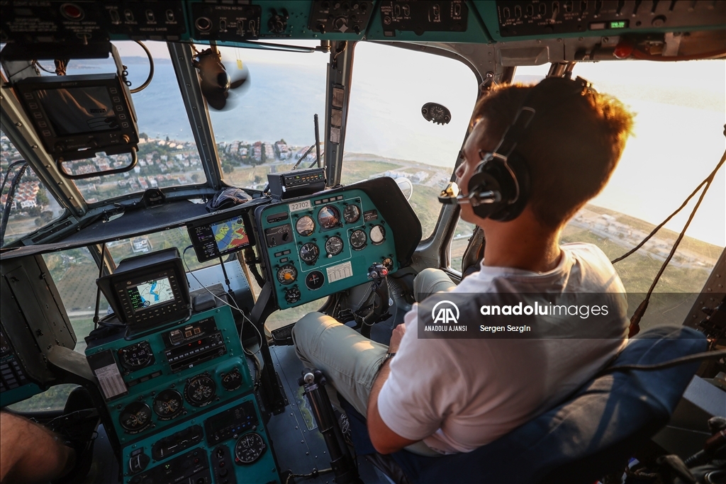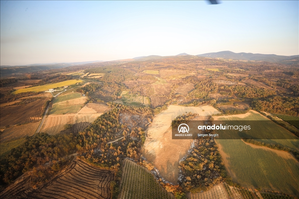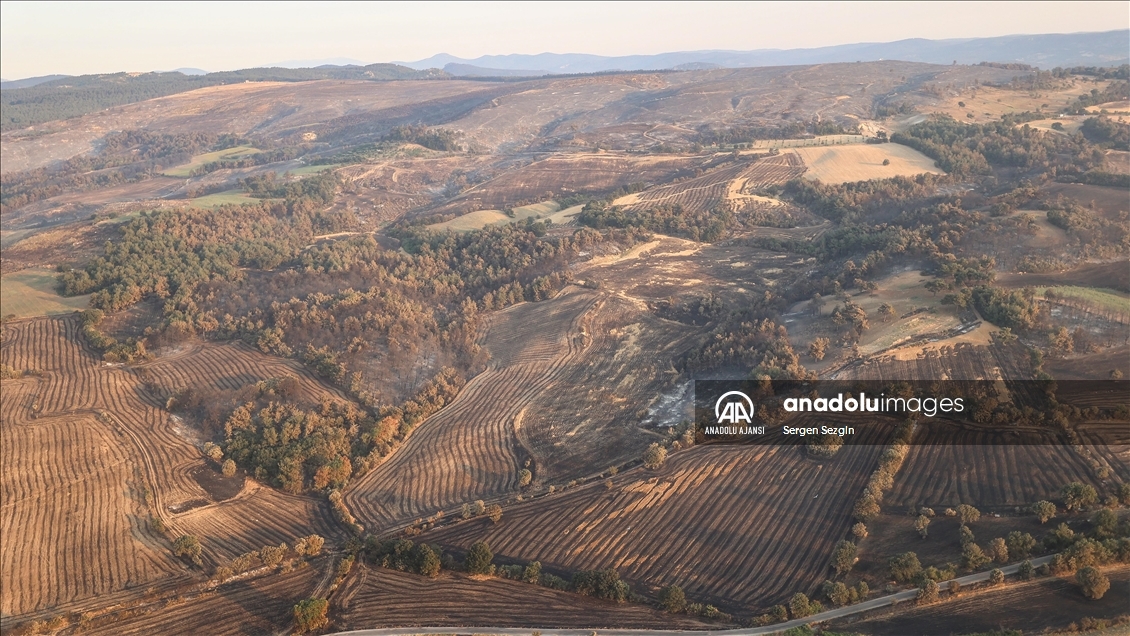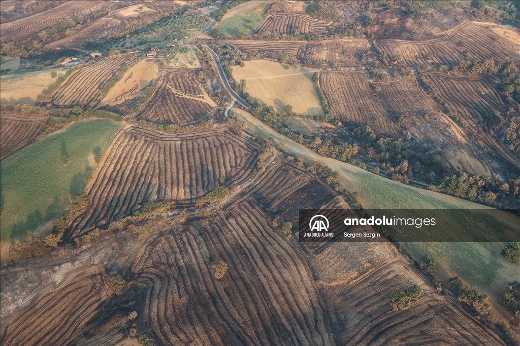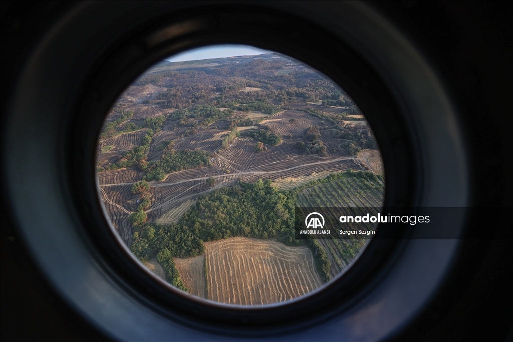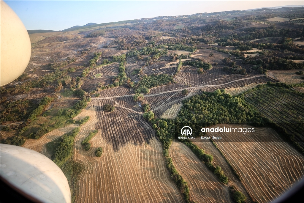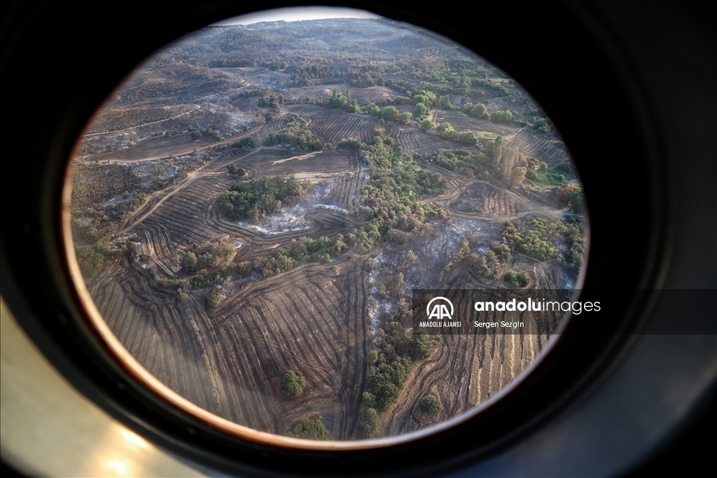 AA ekibi, alevlerin hasara neden olduğu ormanlık alanlar ile tarım arazilerini Çanakkale Orman Bölge Müdürlüğüne ait helikopter yardımıyla havadan görüntüledi.