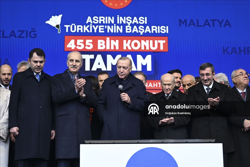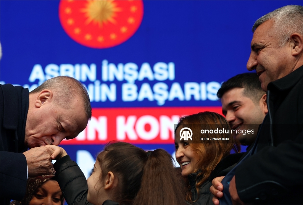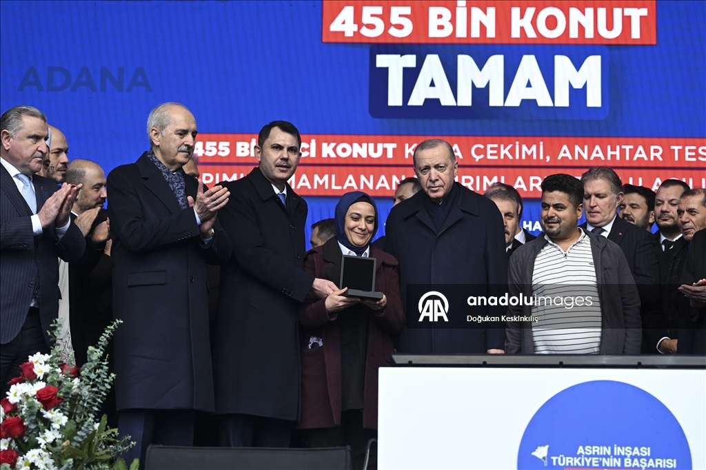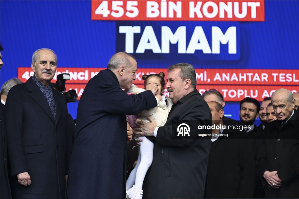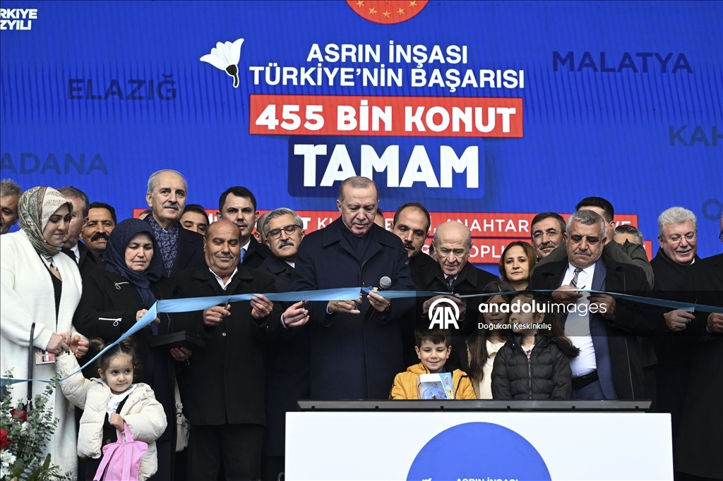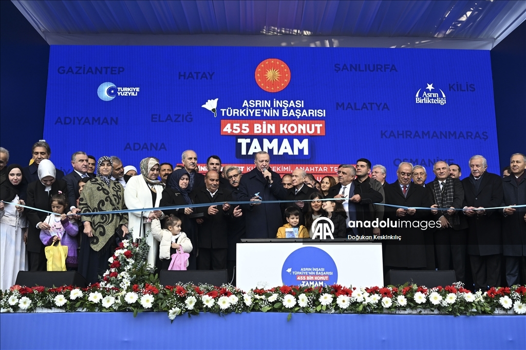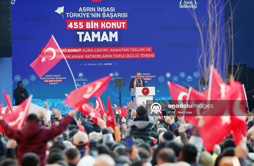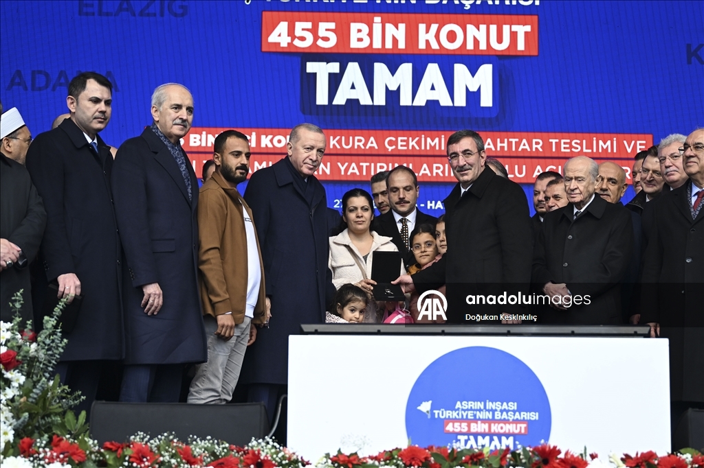 Bugün dünyada hemen hiçbir ülkenin altından kalkamayacağı büyük bir başarıya Hatay'da bizzat tanıklık ettiklerini söyleyen Erdoğan, "Depremin vurduğu 11 ilimizde yapımı tamamlanan 455 bininci afet konutumuzu hak sahibi kardeşlerimize teslim etmenin gururunu yaşıyoruz." diye konuştu.