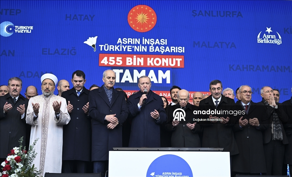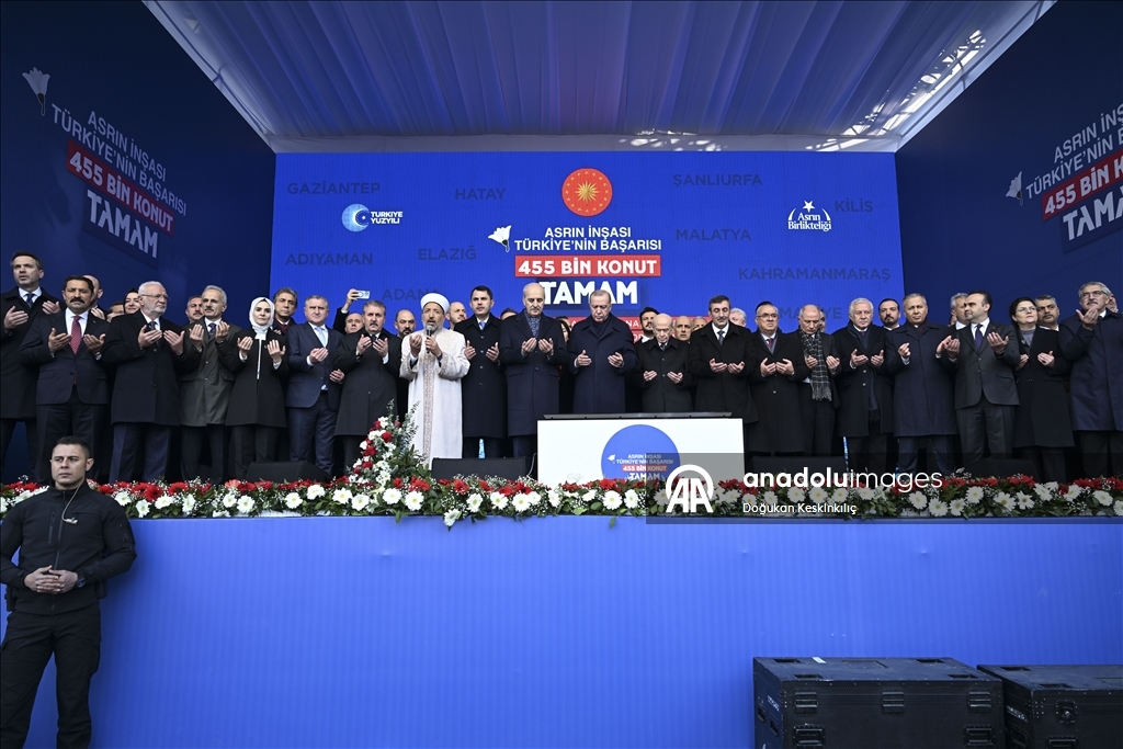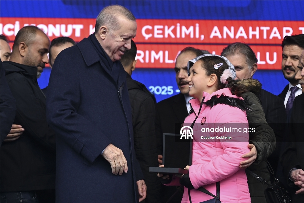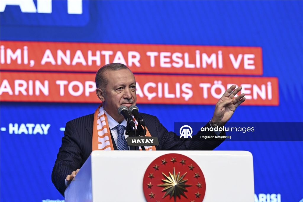 Hatay'daki hak sahiplerine konutlarının anahtarlarını teslim eden Erdoğan, Diyanet İşleri Başkanı Safi Arpaguş tarafından edilen duanın ardından yapımı tamamlanan yatırımların toplu açılış kurdelesini de kesti.