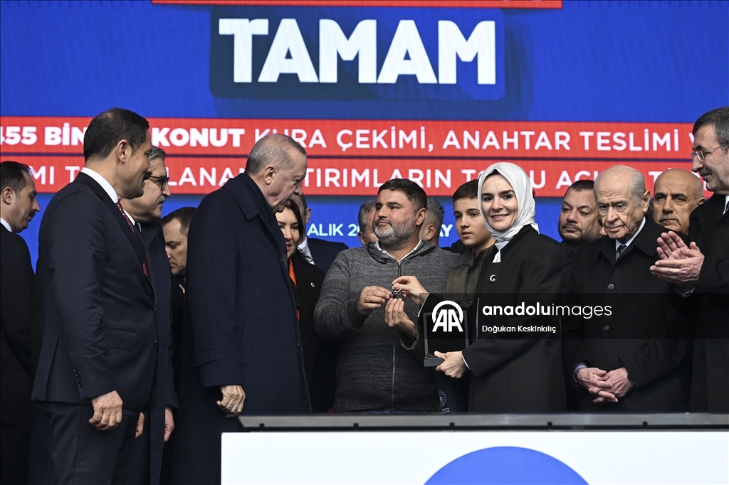 "Böylece sözümüzün arkasında durarak 11 ilimizde 455 bin 357 bağımsız bölümü hak sahibi kardeşlerimizin istifadesine sunuyoruz." diyen Cumhurbaşkanı Erdoğan, konutların hayırlı uğurlu olmasını diledi.
