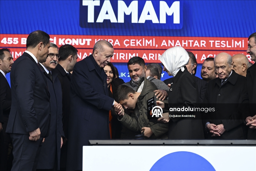 Cumhurbaşkanı Erdoğan, Hatay Atatürk Caddesi'nde düzenlenen "455 Bininci Afet Konutu Kura Çekimi, Anahtar Teslimi ve Yapımı Tamamlanan Yatırımların Toplu Açılış Töreni"ne katıldı.