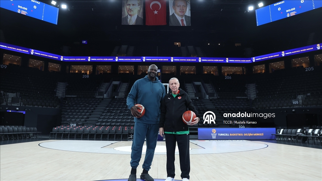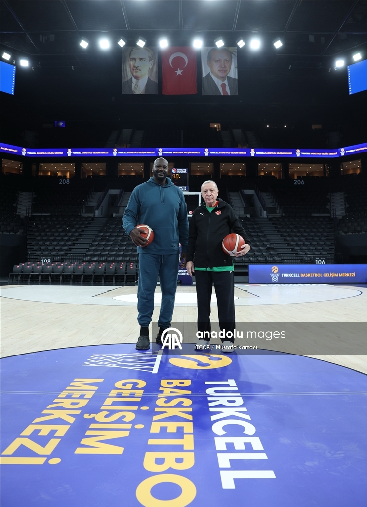 İstanbul'da Turkcell Basketbol Gelişim Merkezi'nde basketbol oynayan Erdoğan ve O'Neal, basketbol toplarını imzaladı.