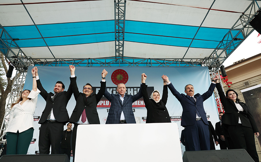 "Gördüğünüz gibi saatlerce anlatsak bitmeyecek eserlerimiz ve hizmetlerimiz var. Sizlerden sandığa giderken tüm bu eser ve hizmetleri gözünüzün önüne getirerek karar vermenizi özellikle istiyorum. Ben Eskişehir'in en doğru kararı vereceğine inanıyorum. Biz 20 yıldır sadece eser ve hizmet siyaseti yaptık şimdi de Türkiye Yüzyılı vizyonumuzla bu eser ve hizmet siyasetini taçlandırmak istiyoruz. Biz dersimizi iyi çalıştık, bununla geliyoruz.