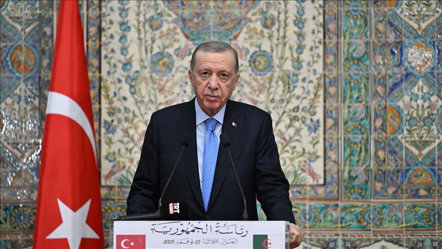Cezayir Cumhurbaşkanı Abdülmecid Tebbun'la birlikte sahip oldukları karşılıklı iradenin meyvelerini başta ticaret ve ekonomi olmak üzere her alanda gördüklerini kaydeden Erdoğan, "Ticaret hacmimiz geçtiğimiz sene, bir önceki yıla göre yüzde 27 artışla rekor seviye olan 5,3 milyar dolara yükseldi. Artış eğilimi bu sene de devam ediyor. 2023'ün ilk on ayında ticaret hacmimiz, geçtiğimiz yılın aynı dönemine kıyasla yüzde 19'luk yükselişle 5 milyar dolara ulaştı. İnşallah sene sonunda 6 milyar dolar bandını yakalamış olacağız." diye konuştu.
