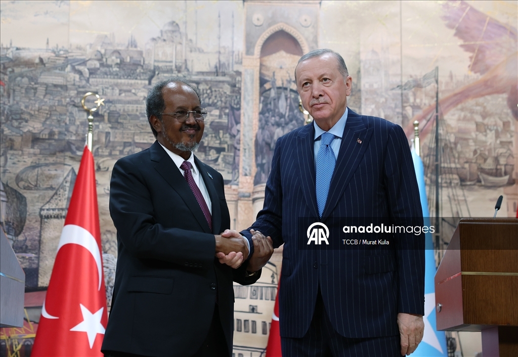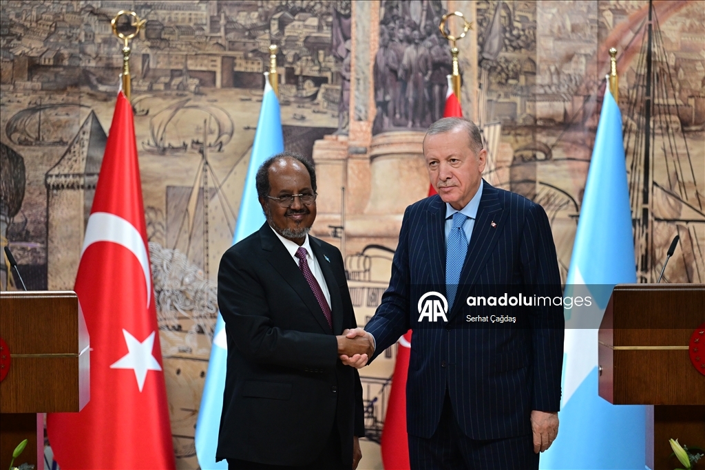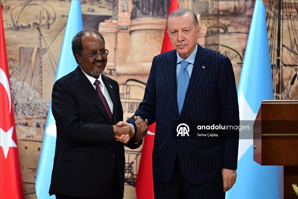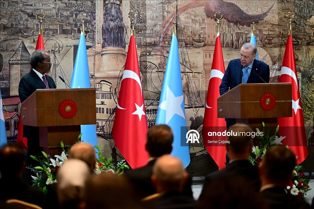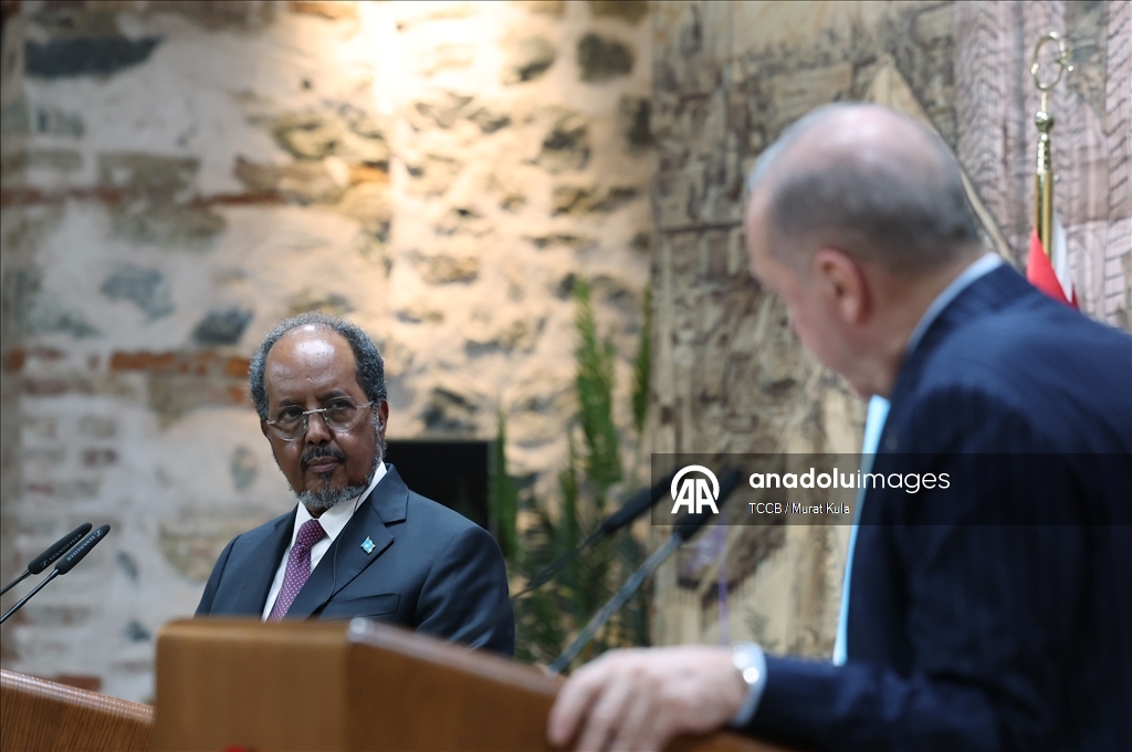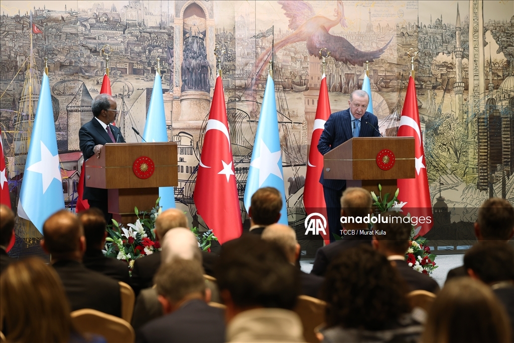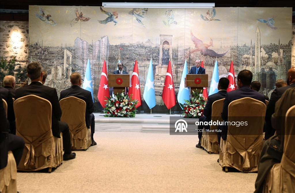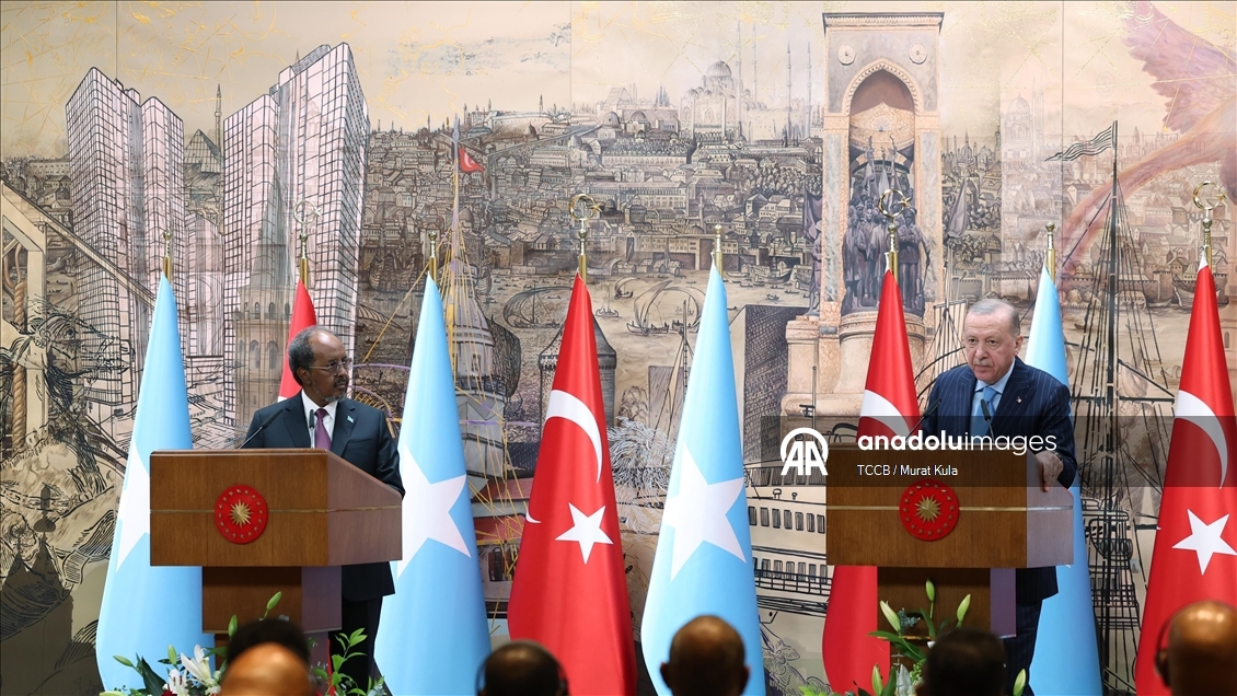 Cumhurbaşkanı Recep Tayyip Erdoğan, Dolmabahçe Çalışma Ofisi'nde ikili ve heyetler arası görüşmelerinin ardından Somali Cumhurbaşkanı Hasan Şeyh Mahmud ile ortak basın toplantısı düzenledi.