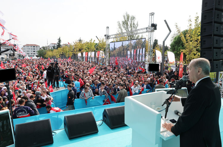 "Biz hükümete geldiğimiz günden itibaren gerçekleştirdiğimiz demokrasi ve kalkınma atılımlarıyla işte bu makus tarihi değiştirdik. Önce ülkemizi hayata geçirdiğimiz asırlık eser ve hizmetler sayesinde 2023 hedefleriyle buluşturduk. Ardından milletimizin önüne gençlerimize bırakacağımız en büyük miras olarak gördüğümüz 2053 vizyonumuzla çıktık. Şimdi de Türkiye yüz yılı ile tüm bu yatırımları taçlandırıyoruz. Ülkemizin dünkü meselelerini hatırlayın. İnsanlarımızın güvenlik kaygıları vardı. Terör örgütleri cirit atıyordu. Huzura hasret günler geçiriyorduk. Bu tehditlerin hepsini bitirdik mi? İnsanlarımızın eğitimden sağlığa, ulaşımdan spora, her alanda temel hizmetlere erişme sıkıntısı vardı. Yaptığımız eserlerle bunları da çözdük mü? Çözdük. İnsanlarımızın ülkesinin gücünü, itibarını, büyüklüğünü görme, hissetme hayali vardı. Bunu da sağladık mı?"