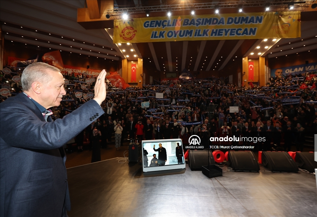 Cumhurbaşkanı Erdoğan'ın "Erzurum 2023 için kapı kapı dolaşmaya var mıyız?", "İlk oyum Erdoğan'a ilk oyum AK Parti'ye diyerek tüm arkadaşlarınızı sandığa götürmeye var mıyız?", "Gençler, Türkiye Yüzyılı'nı hep birlikte inşa ediyor muyuz?", "Sizin eseriniz olacak 2053 Türkiye'sini inşa etmeye hazır mısınız?", "Bir sonraki nesil için 2071 Türkiye'sinin temellerini şimdiden atmaya var mıyız?" sorularını, gençler "evet" diyerek yanıtladı.