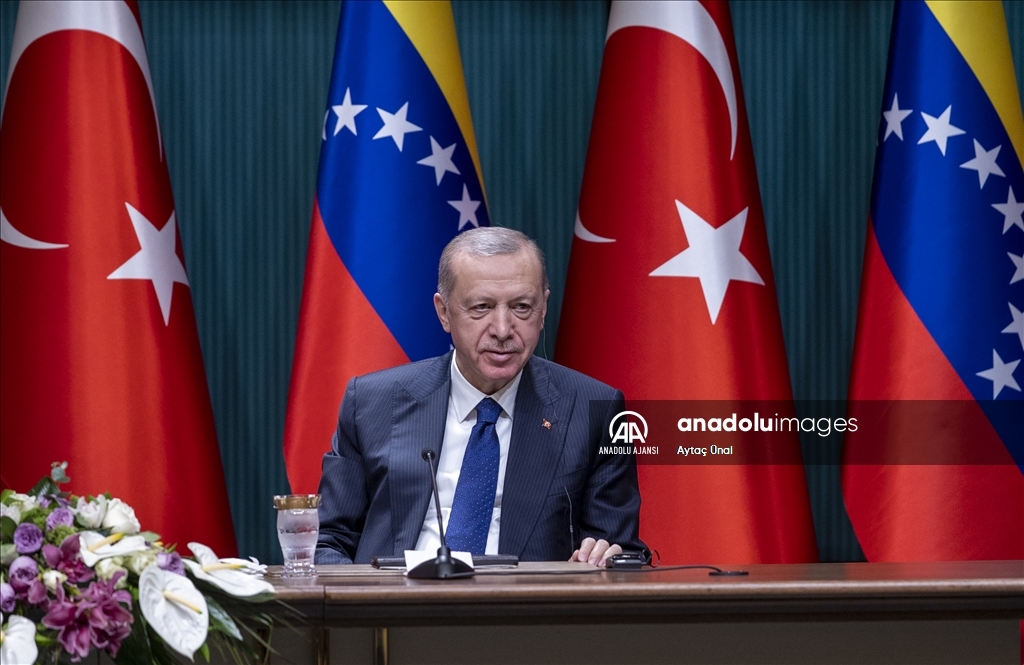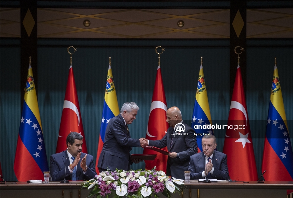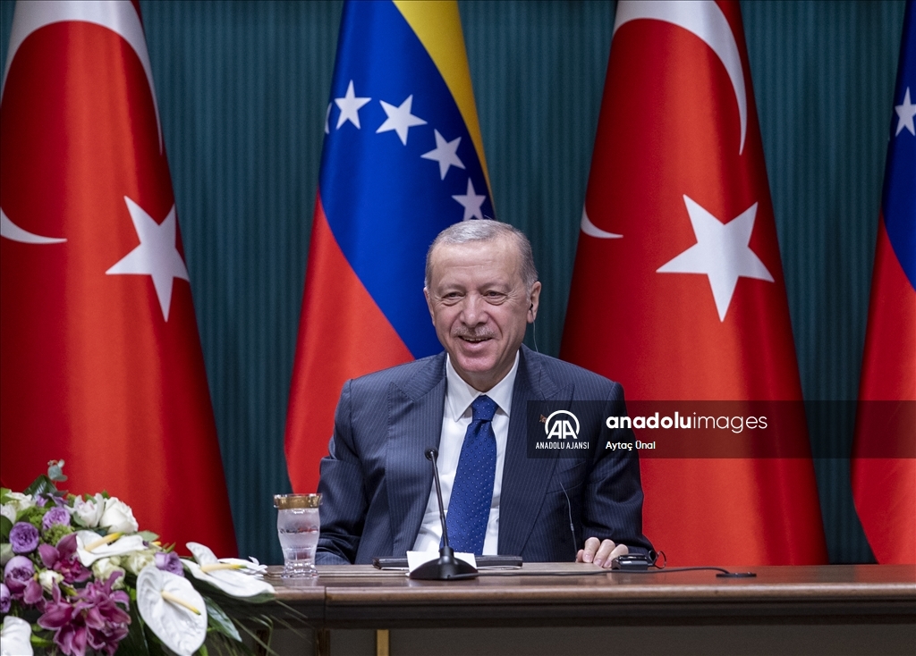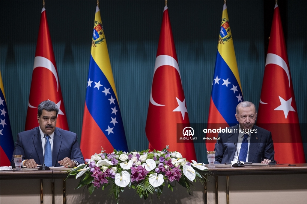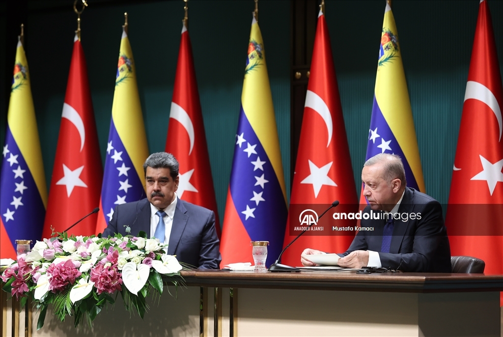 Cumhurbaşkanı Erdoğan ve Venezuela Devlet Başkanı Nicolas Maduro, Cumhurbaşkanlığı Külliyesi'ndeki baş başa ve heyetler arası görüşmeler ile anlaşmaların imza töreninin ardından ortak basın toplantısı düzenledi.