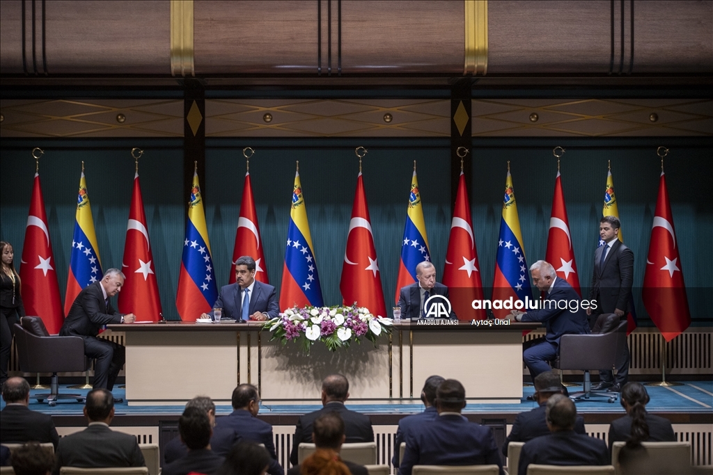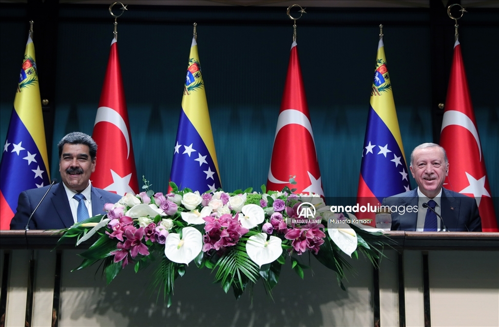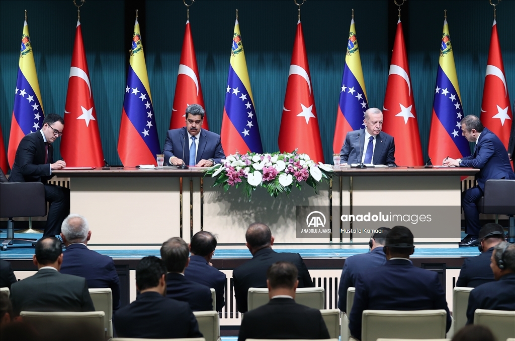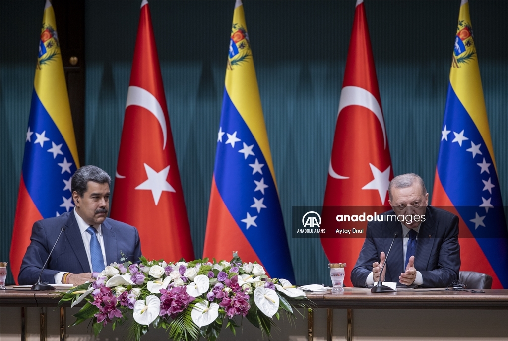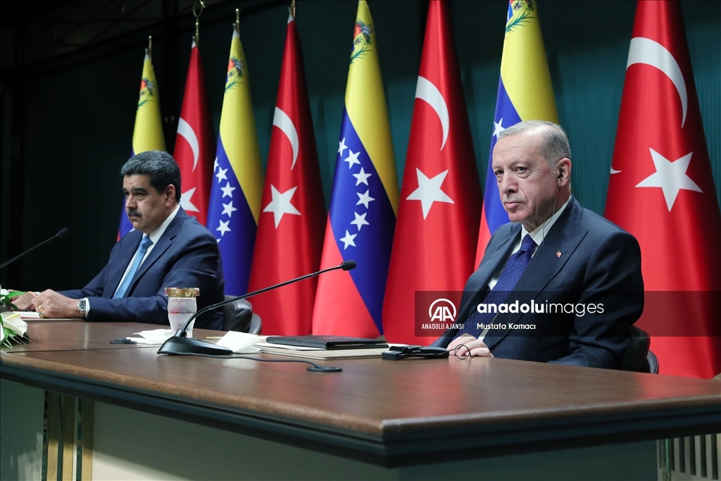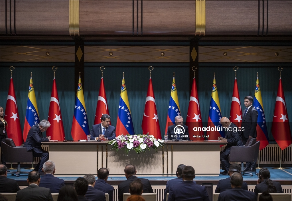 Cumhurbaşkanı Erdoğan ve Venezuela Devlet Başkanı Nicolas Maduro, Cumhurbaşkanlığı Külliyesi'ndeki baş başa ve heyetler arası görüşmeler ile anlaşmaların imza töreninin ardından ortak basın toplantısı düzenledi.