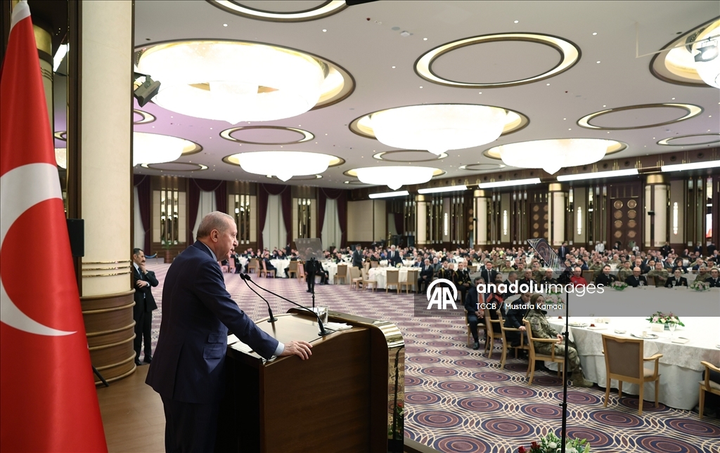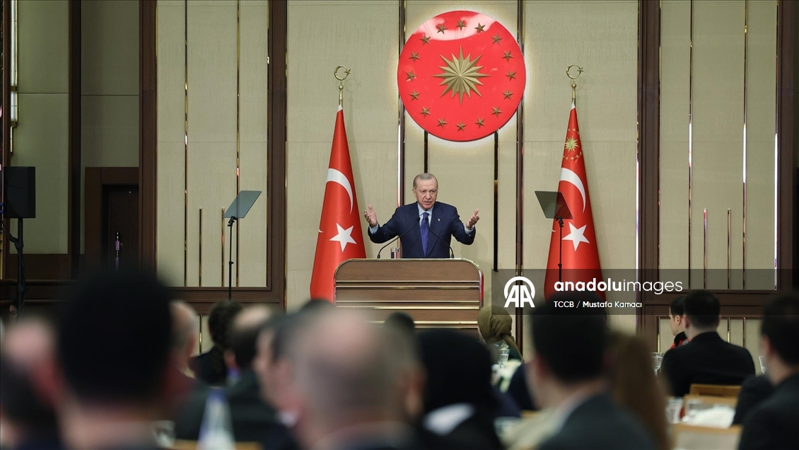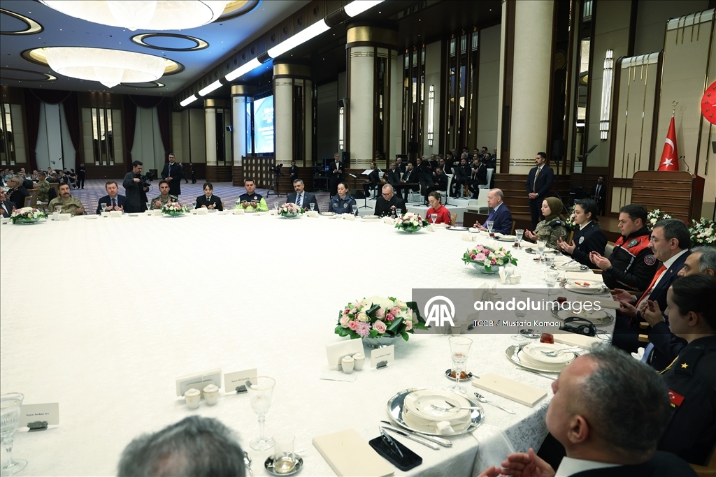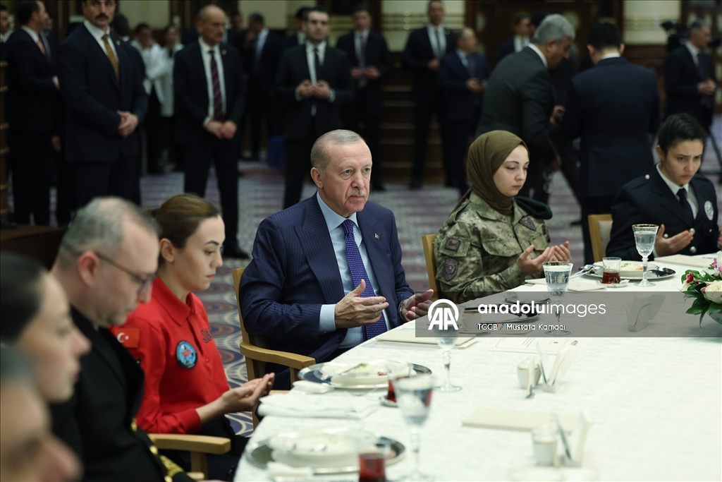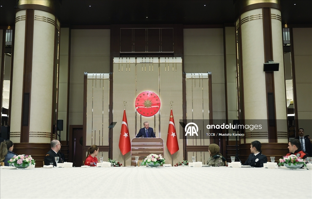 Bu bereketli sofranın başında katılımcıları bir araya getiren İçişleri Bakanlığı, Emniyet Genel Müdürlüğü, Jandarma Genel Komutanlığı ile Sahil Güvenlik Komutanlığına da teşekkür eden Cumhurbaşkanı Erdoğan, "Başı rahmet, ortası mağfiret, sonu cehennem azabından kurtuluş olan mübarek Ramazan-ı Şerifinizi tebrik ediyorum. Bu güzel ve anlamlı buluşma vesilesiyle Malazgirt'ten İstiklal Harbi'ne, Kıbrıs Barış Harekatı'ndan terörle mücadeleye ve 15 Temmuz direnişine kadar mukaddes bildiğimiz bütün değerler adına insanımızın huzuru, birliği, dirliği için şehit düşen kahramanları rahmetle yad ediyorum. Ruhları şad, mekanları inşallah cennet olsun. Hayatta olan gazilerimize hayırlı, uzun ömürler diliyorum. Şehadet ve gaza bilincini adeta hayatının merkezine koyarak çocuklarını, 'Ya şehit ol ya gazi' duasıyla göreve uğurlayan anne babaları şükranla anıyor, bu ruhu halen diri tutan tüm anne babaların ellerinden öpüyorum." ifadelerini kullandı.