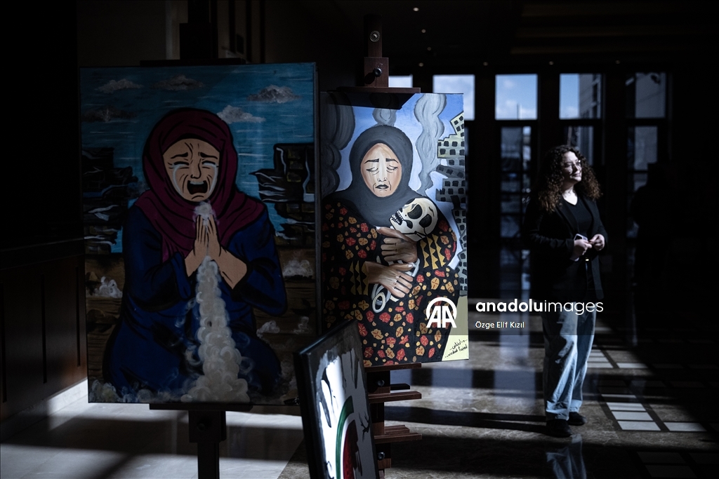 Çankaya Halk Eğitim Merkezi yaz okulu çalışmalarına katılan Filistinli öğrencilerin yağlı boya ve akrilik teknikle hazırladığı 101 eserden oluşan sergide, Gazzeli gençlerin ortaya koyduğu çalışmalar yer aldı.