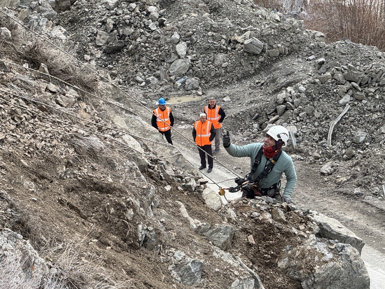 Vatandaşların güvenli yolculuk yapması amacıyla bölgede görevlendirilen 3 kişilik profesyonel dağcı ekibi, dağların yamacında askıda kalan ve düşme tehlikesi bulunan kayaların oluşturduğu riski ortadan kaldırmak için mesai yapıyor.