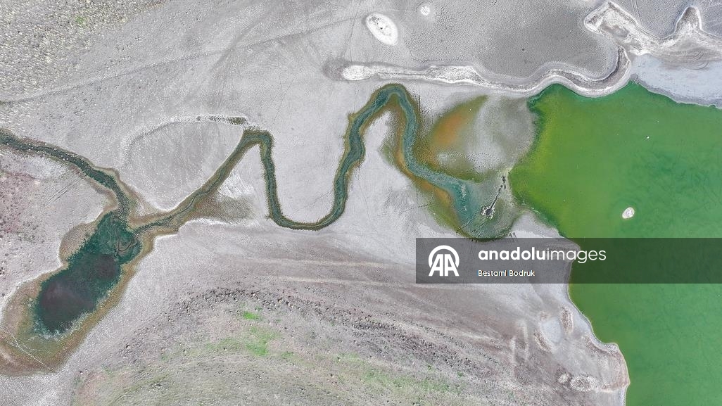 Çekilmenin etkisiyle daralan ve kuruma tehlikesi yaşayan gölün tabanındaki çamurda besin bulmaya çalışan kuşlar, Anadolu Ajansı (AA) ekibince havadan görüntülendi. Gölette geçen ay kaydedilen görüntüler, çekilmenin boyutunu gözler önüne serdi.