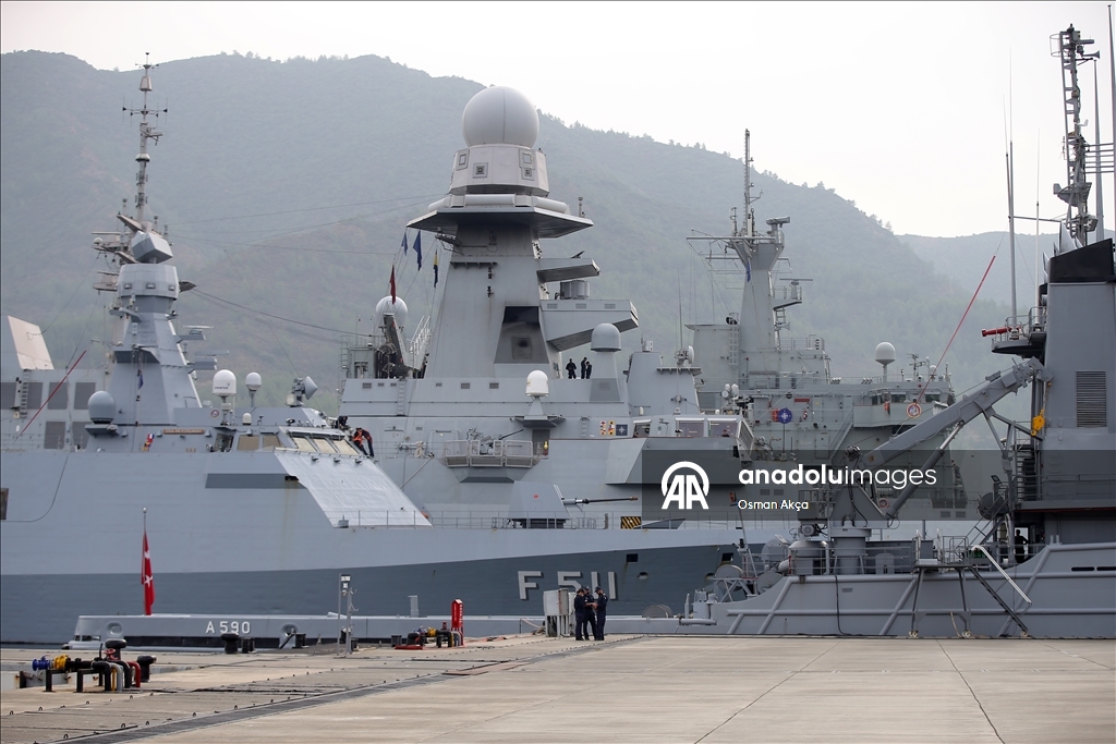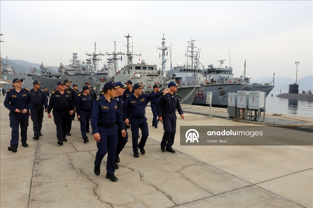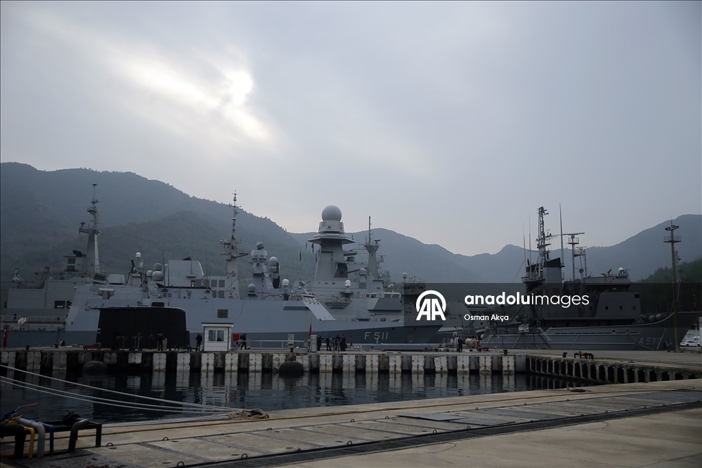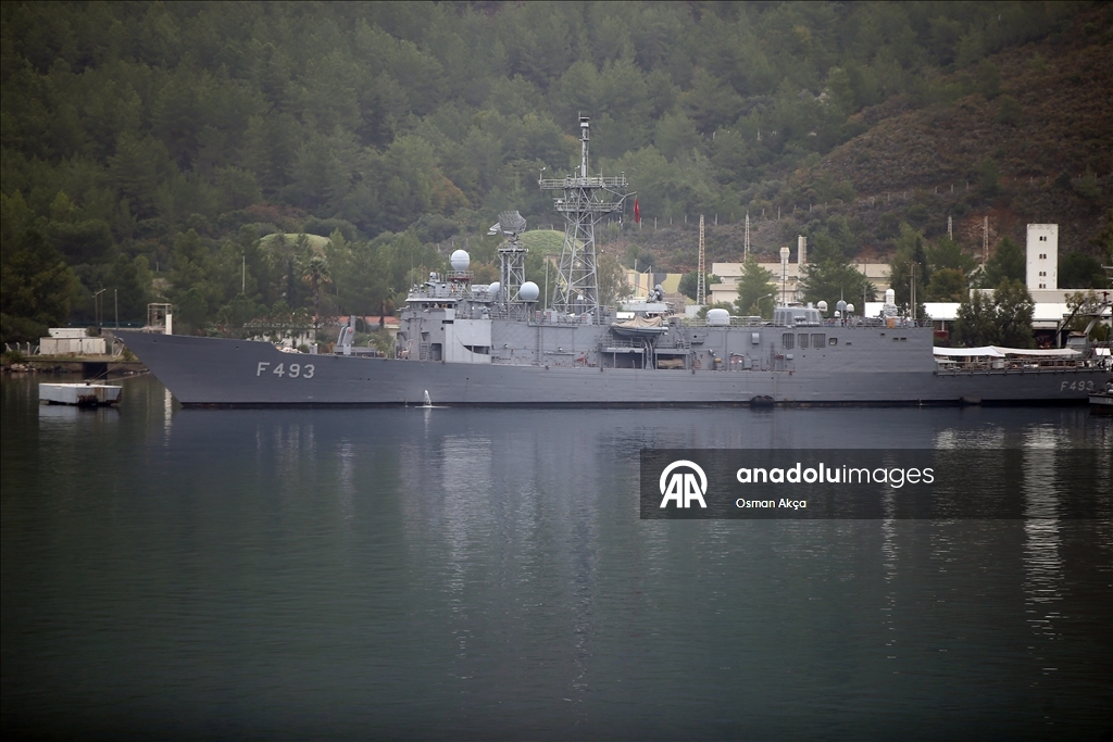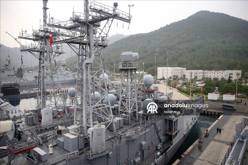 Marmaris'teki Aksaz Deniz Üs Komutanlığı'nda bulunan TCG Sancaktar fırkateyninde düzenlenen brifingde, Deniz Kurmay Binbaşı Ali Ercüment Opçin sunum yaptı.