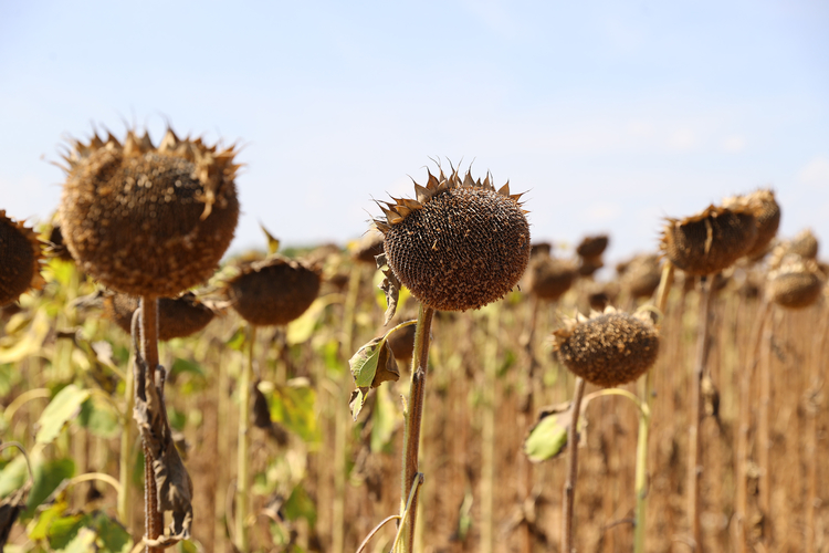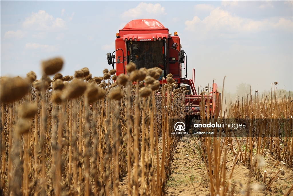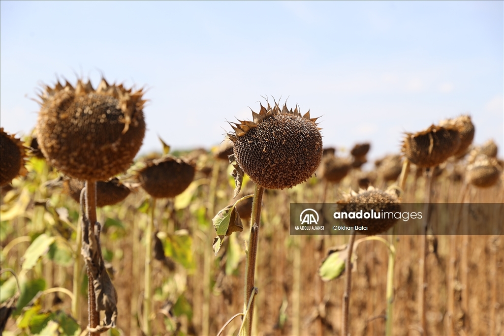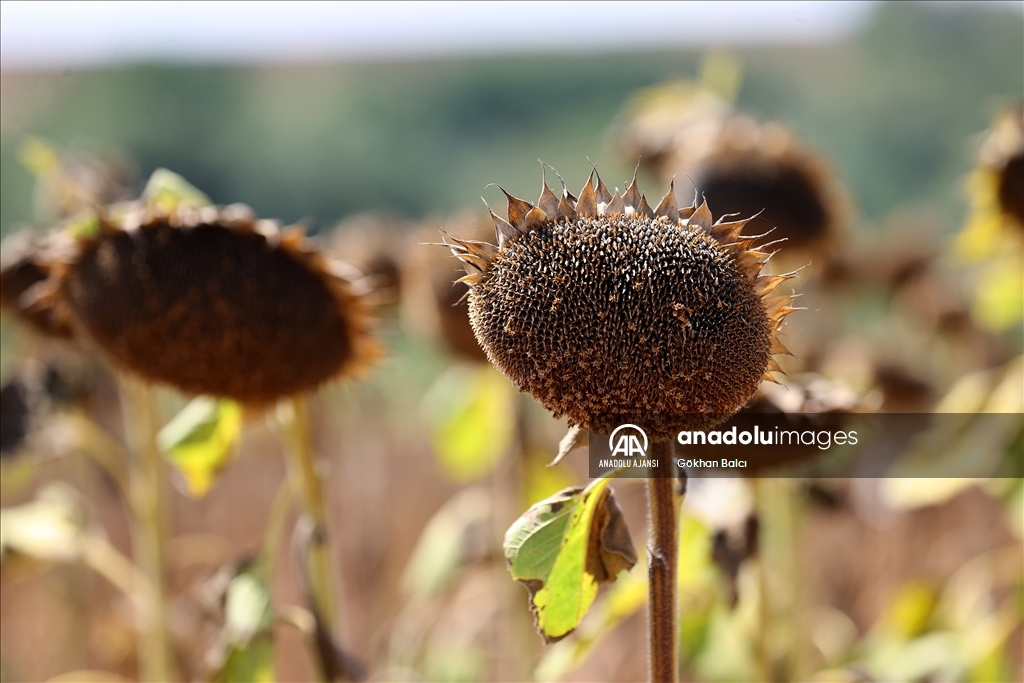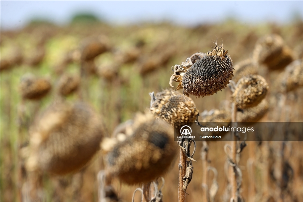 Bölgede "gündöndü" olarak da anılan ayçiçeğinde erken ekim yapılan tarlalarda kuruyan ayçiçekleri biçerdöverlerle hasat ediliyor.